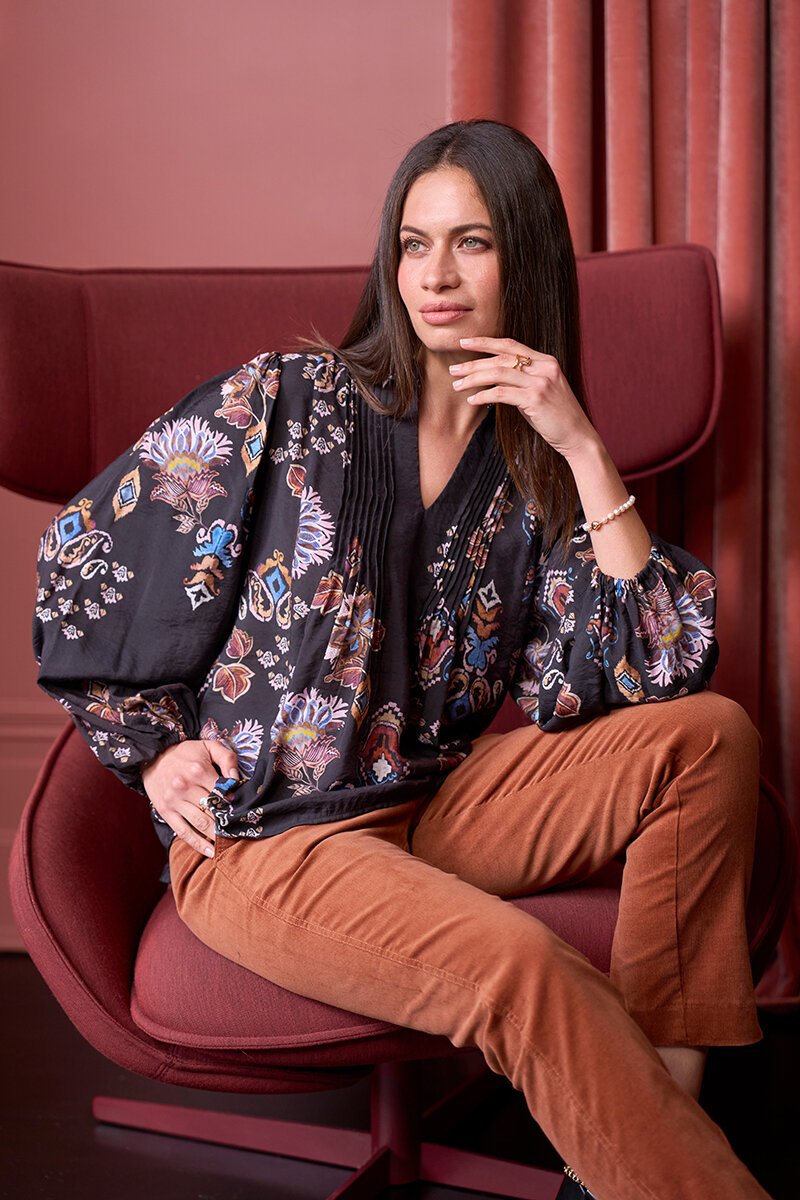 The Loobies Story Gilded Lotus Blouse feels instantly elevated with it's rich black base and intricate multi-tonal print. Floaty through the body with soft detailing, it’s an easy way to add interest to your everyday looks.