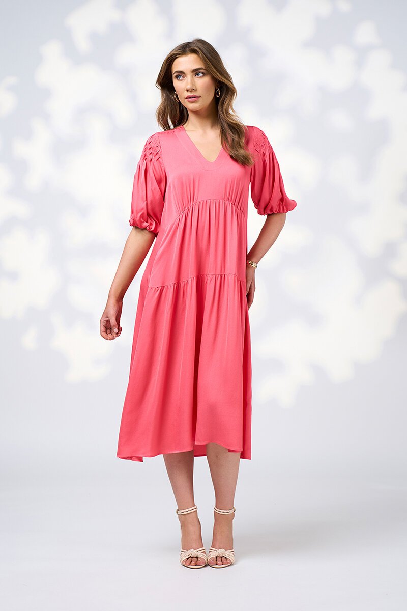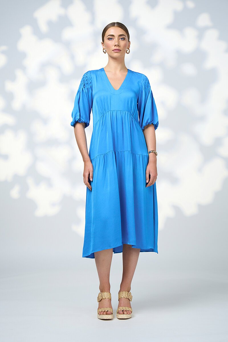 The Loobies Story Jada Midi Dress is that easy summer piece you reach for when you want to look polished with zero fuss. Soft tiers, a flattering V-neck, and gently puffed sleeves create gorgeous movement. Dress it up, dress it down—always beautiful, always comfortable.