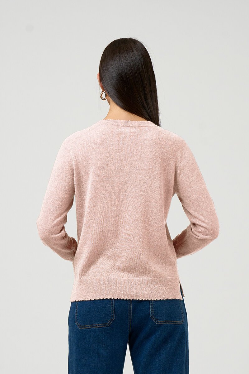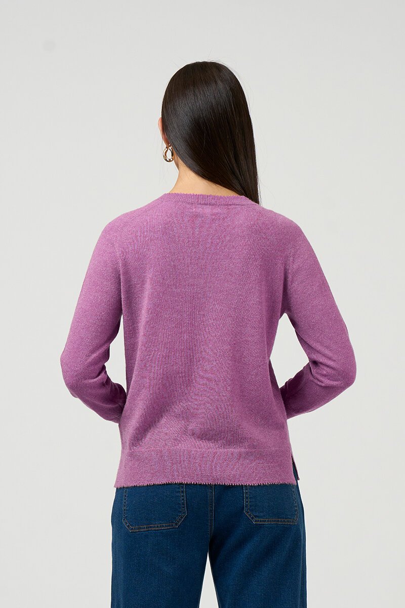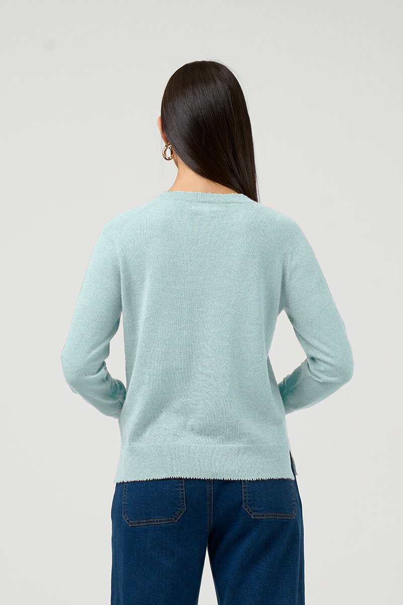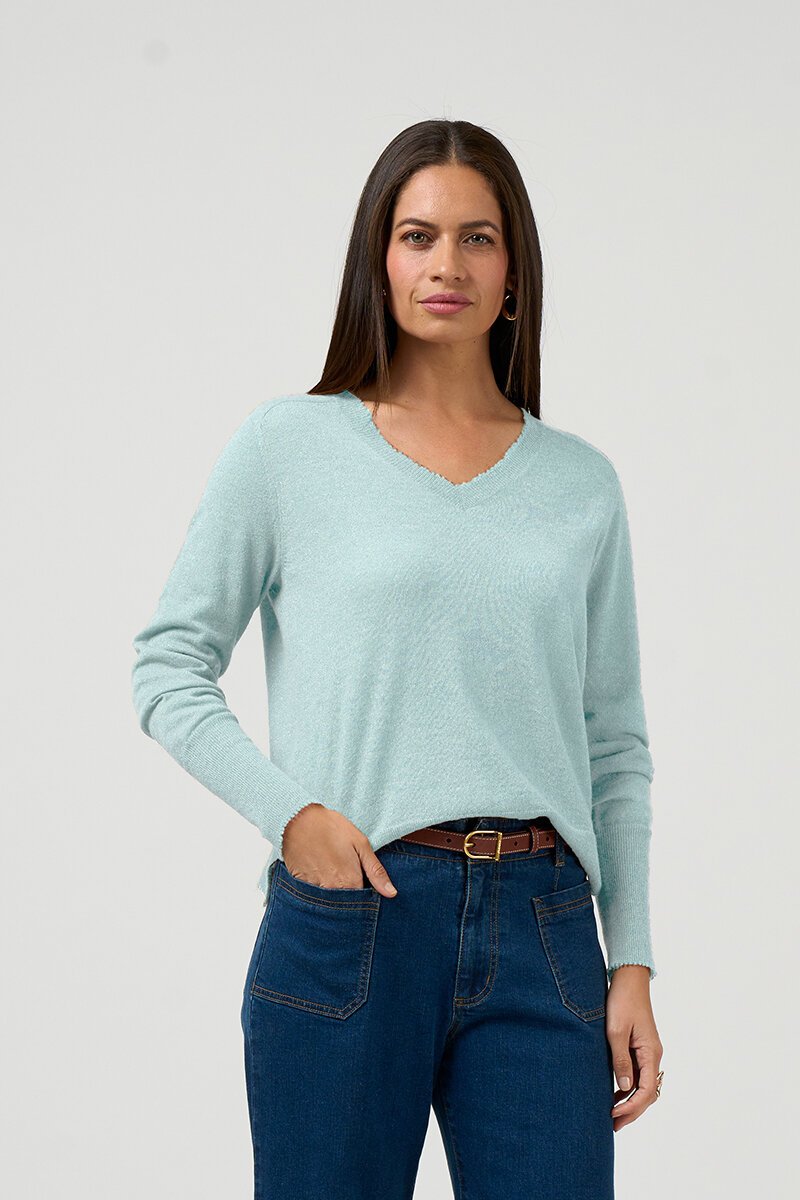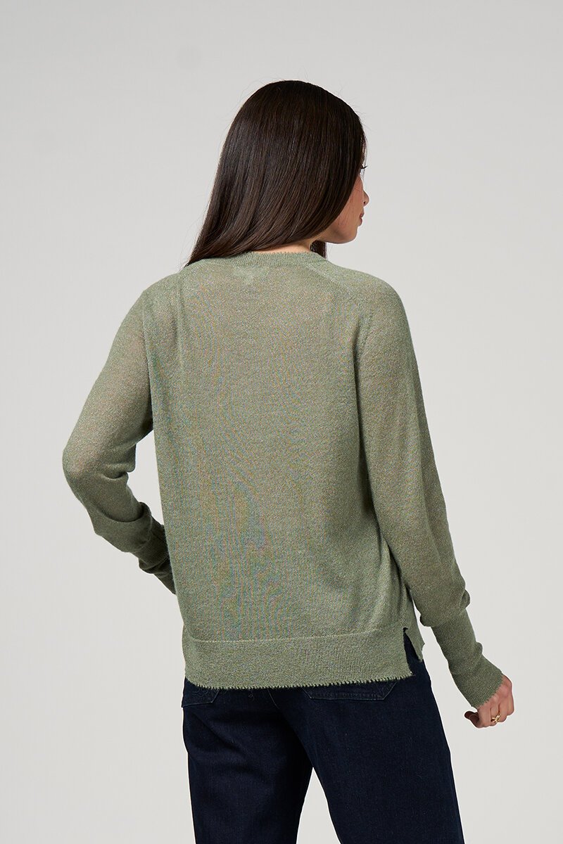 The Loobies Story Lumira Sweater is a lightweight raglan V-neck knit with a subtle metallic shimmer, finished with delicate picot edging and side splits for easy, everyday wear.