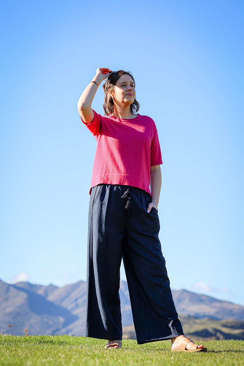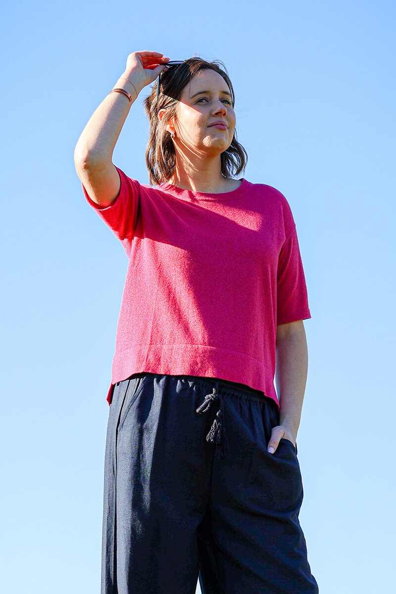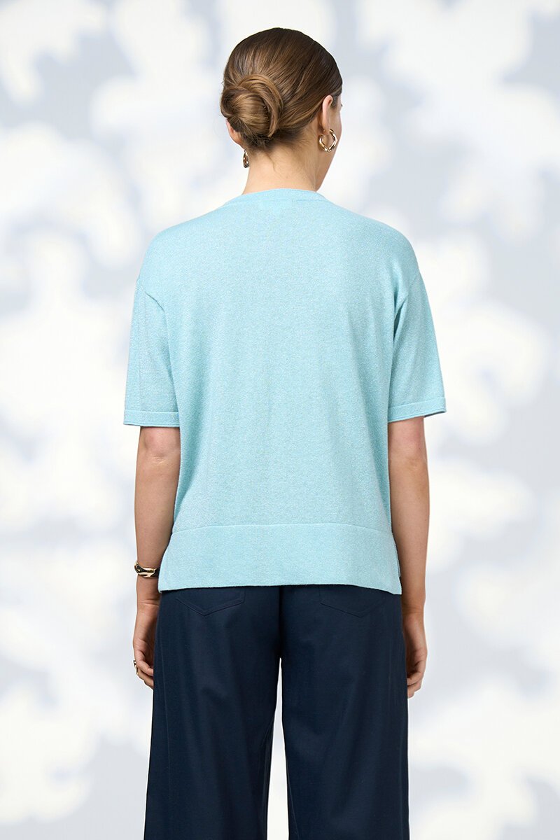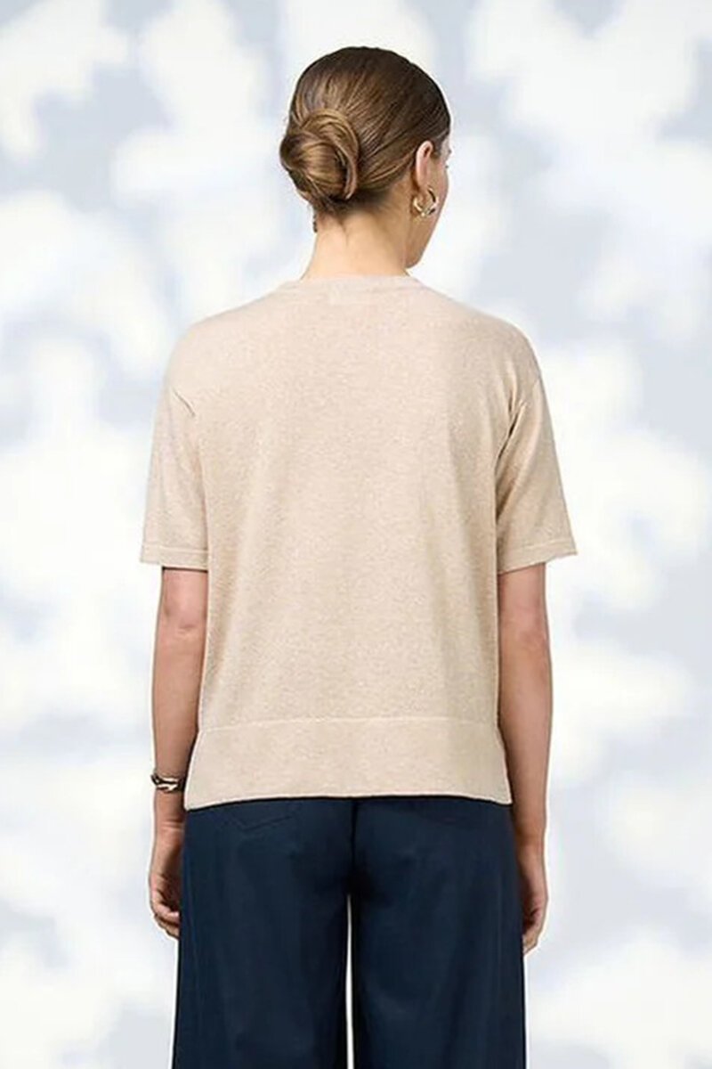 Simple but elevated, the Mica Tee is a relaxed knit with subtle shimmer and a soft drape. Featuring a crew neckline, short sleeves, and a stepped hem, it's an easy throw-on piece that still feels polished. Tuck it, layer it, love it.