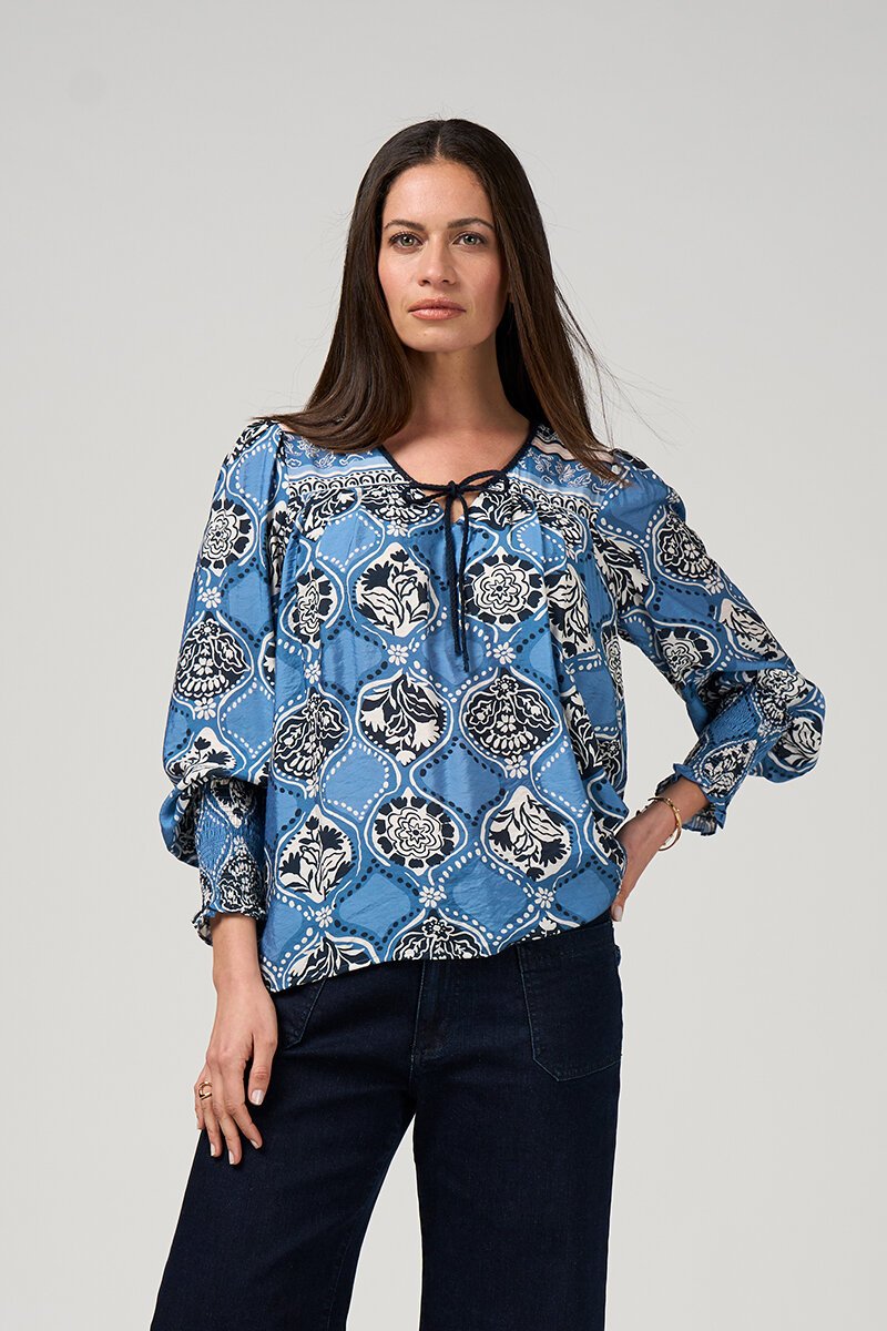 The Loobies Story Taj Mahal Blouse is a beautiful floaty V-neck style with braided cotton trim through the neckline, flowing into a soft tie and finished with deep shirred elastic cuffs.