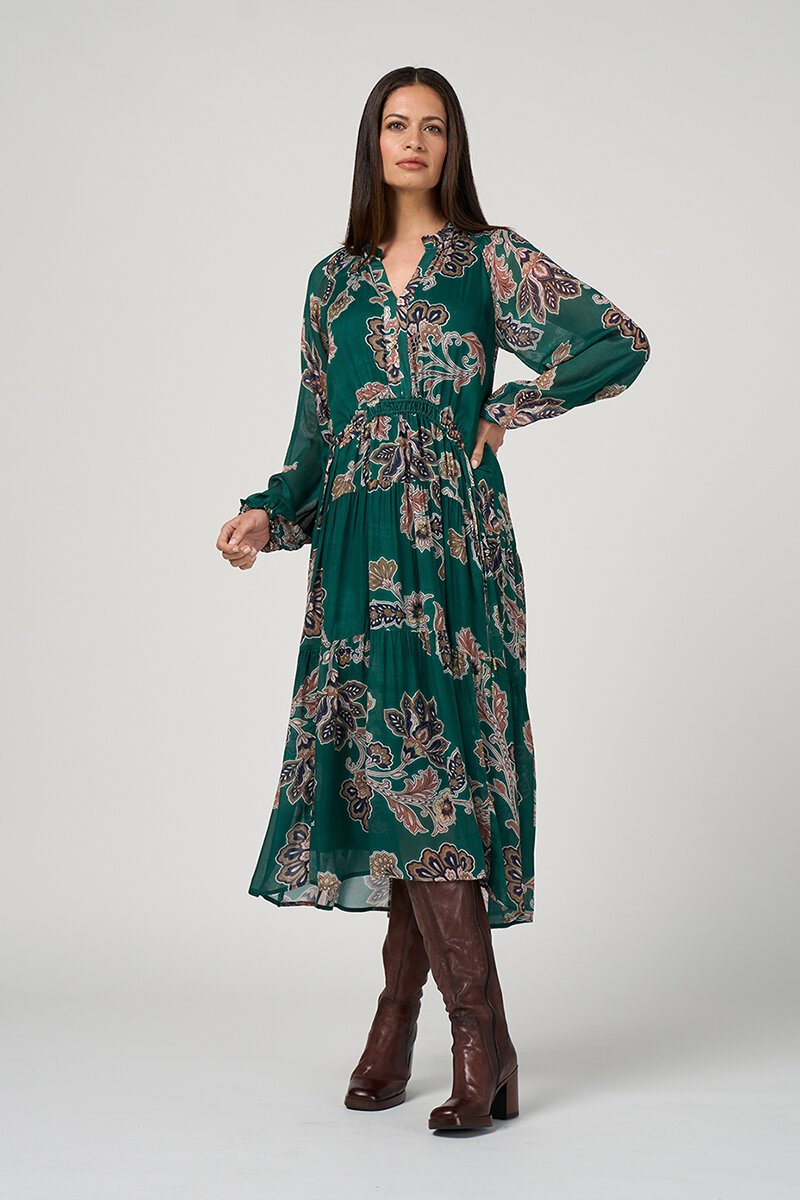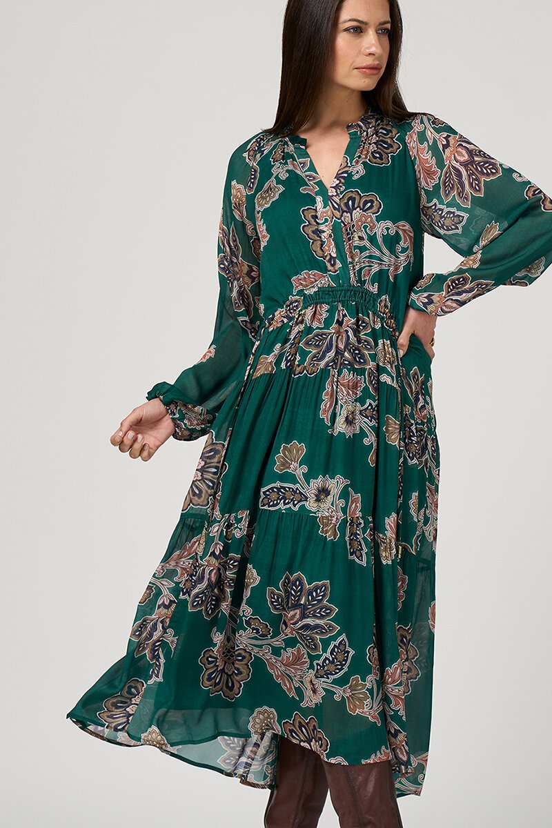 The Loobies Story Versailles Dress is an elegant midi style with a rich floral print that feels both timeless and striking. The relaxed silhouette and soft sleeve detail create beautiful movement, making it perfect for effortless day-to-evening