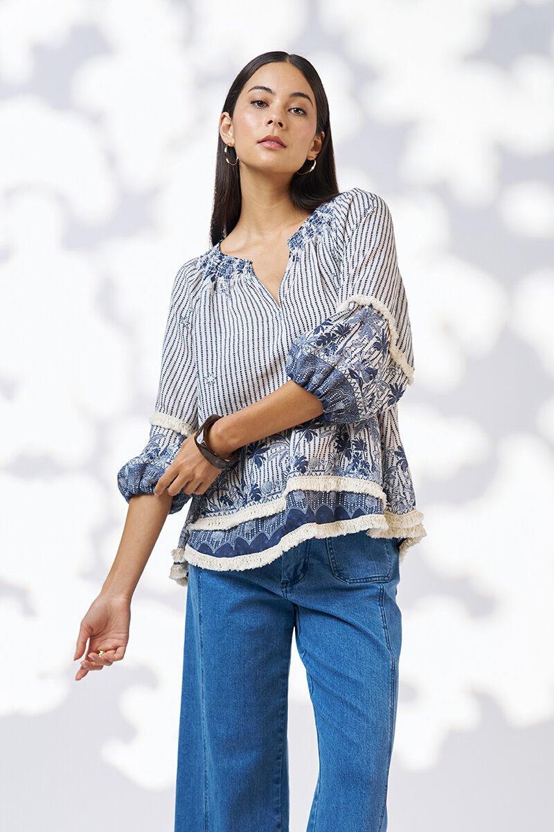 The Loobies Story Xanthe Top is made for days when you want easy polish with a hint of drama. The shirred neckline falls into a soft V, while the voluminous sleeves and fringing trim bring playful movement. Pair it with denim for weekend cool or linen pants for resort-ready chic.