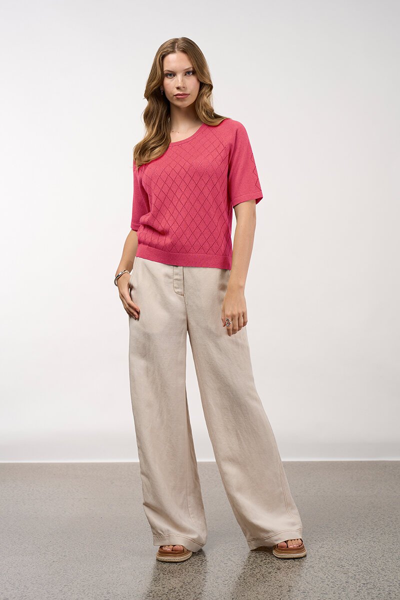 Everyday ease, elevated. The Aero Tee blends a relaxed silhouette with a diamond pointelle knit detail for a modern take on the classic short-sleeve. It’s light, luxe, and endlessly layerable—dress it up, pare it back, repeat on rotation.