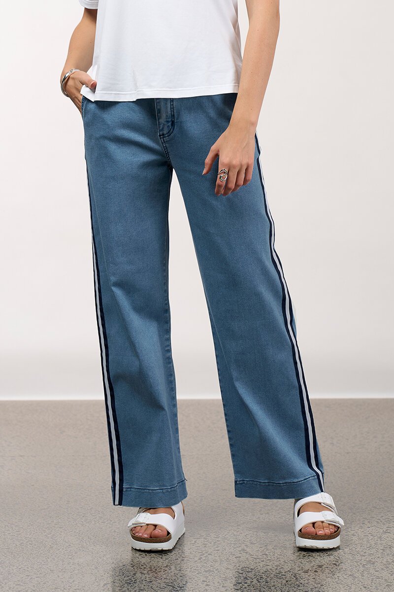 The Charli Pant brings a sporty twist to everyday denim. With its relaxed wide leg, striped side tape, and comfortable elastic back waistband, it’s your go-to for off-duty dressing that still feels polished. Pair with sneakers or slides and go.