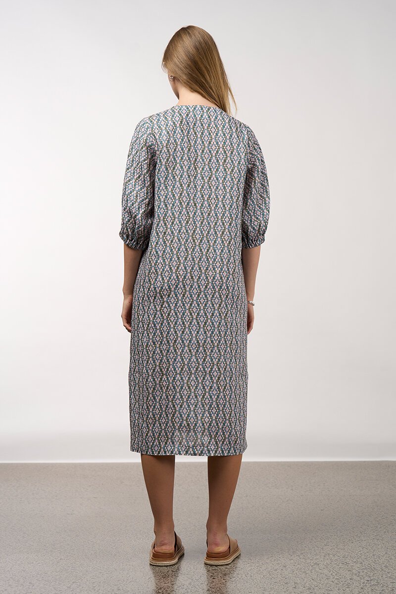 A breezy, everyday style with subtle statement. The Kinetic Dress is cut in a relaxed silhouette with a soft V neckline, gently puffed sleeves, and a midi-length hemline with side splits. Finished with handy side pockets and an all-over geometric print, it's an easy throw-on that still looks considered.