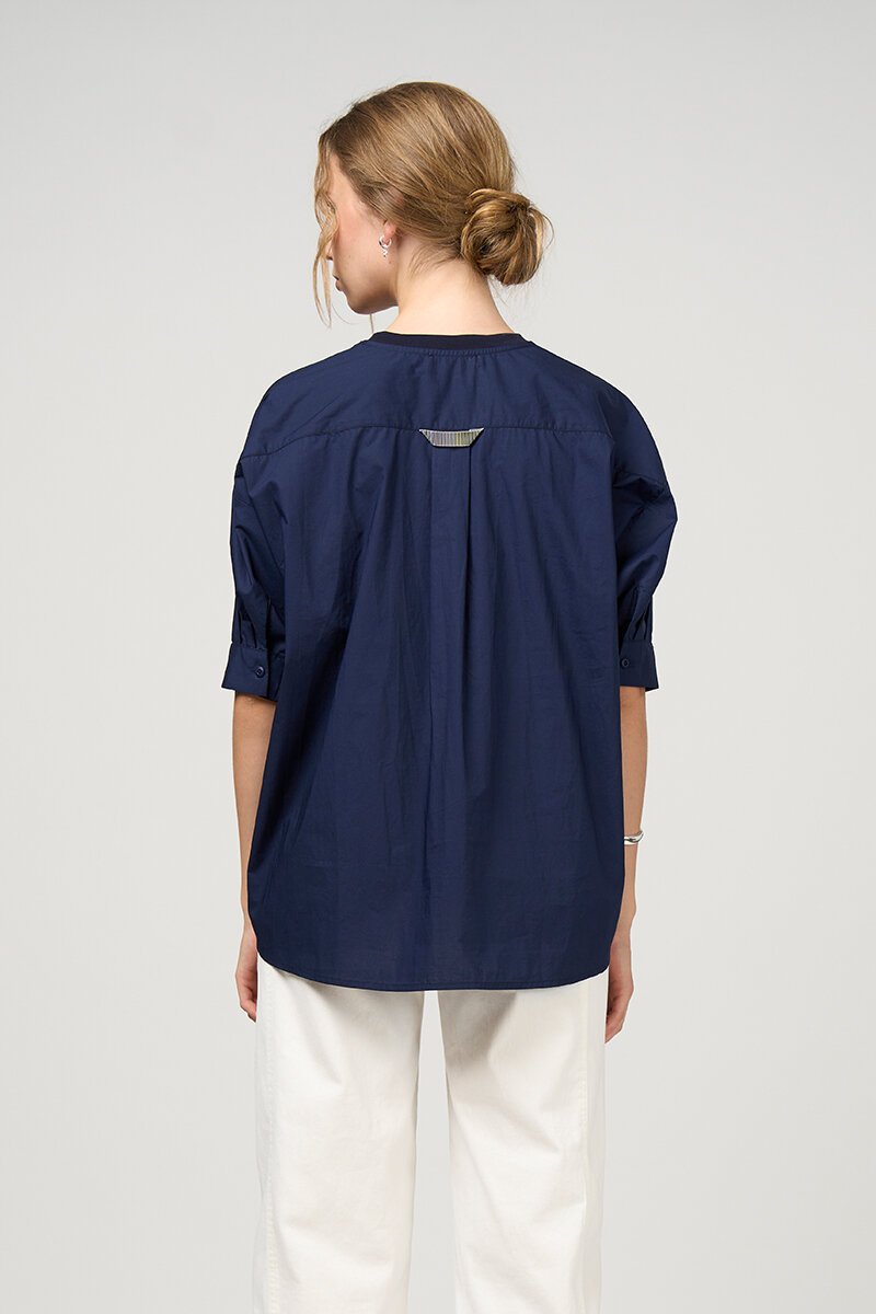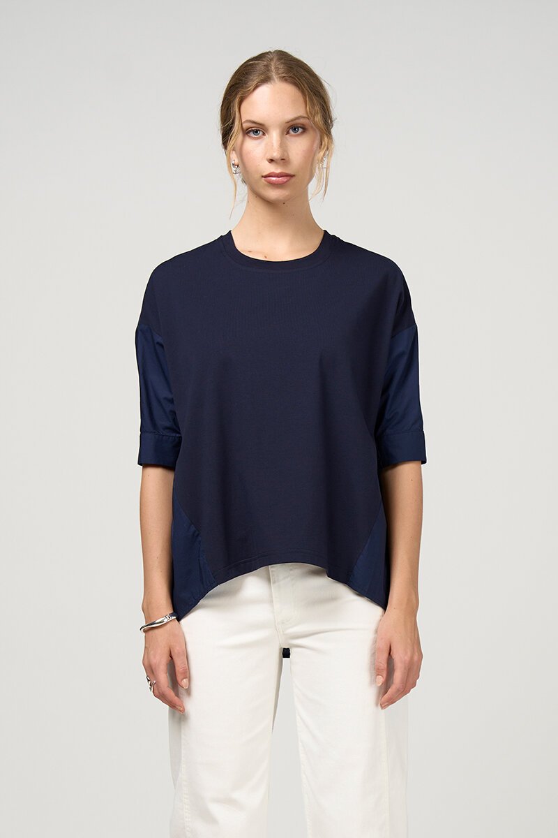 A modern update on your everyday tee, the Mixed Media Top blends comfort with polish. With its relaxed fit, cotton jersey front and crisp poplin sleeves and back, it’s the perfect mix of casual and refined. Forward seams and elasticated button cuffs add subtle shape, while the 3/4 sleeves keep it versatile for workdays or weekends.