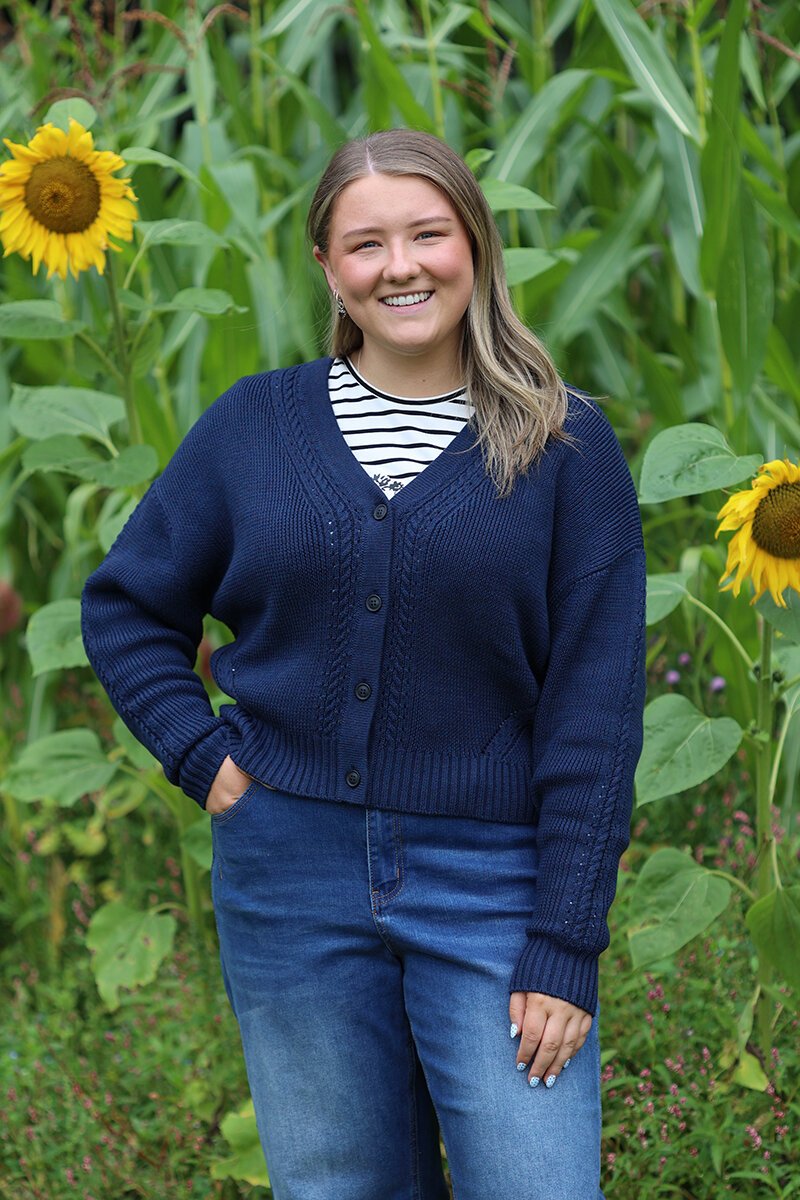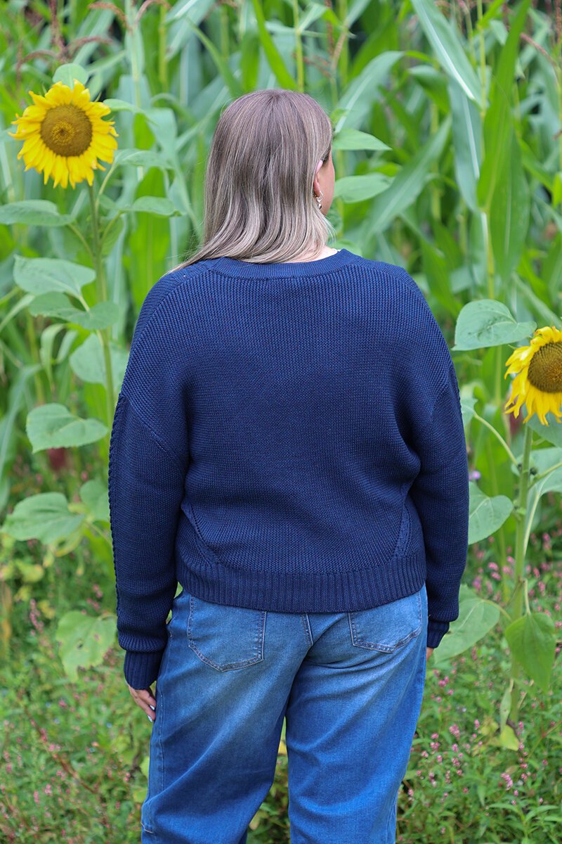 Lisa is wearing a size Large in the Navy