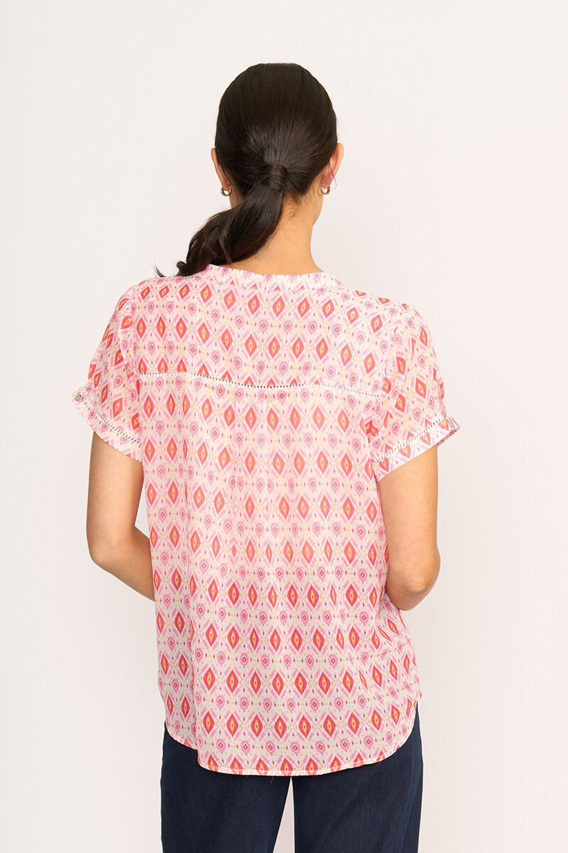 The Memo Drop Hem Blouse is light, floaty, and perfect for warm weather. With its easy shape, curved hem, and playful print, it’s just the thing to dress up denim or pair with tailored shorts for a relaxed summer look.