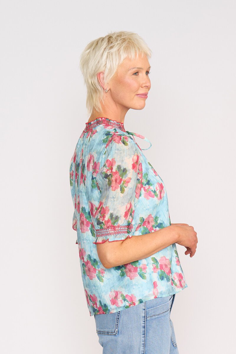 The Memo Shirred Short Sleeve Blouse is soft, floaty, and beautifully detailed. With sheer sleeves, shirred cuffs, and a tie neckline, it’s the kind of easy top that feels special without trying too hard — perfect with white denim or linen.