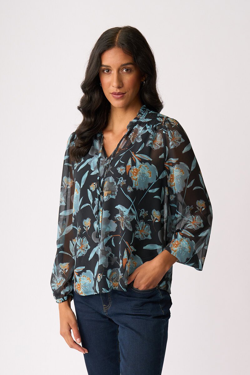 The Memo Shirred Yoke Blouse combines elegance with ease. Featuring a V neck with tie detail, elasticated cuffs, and a relaxed fit, it offers effortless style. Layer it over a camisole and pair with tailored pants for a sophisticated ensemble.
