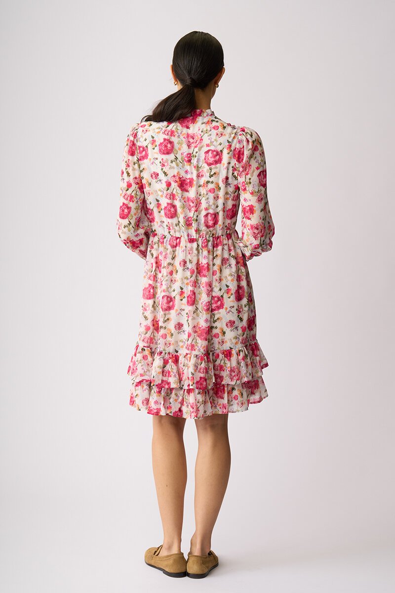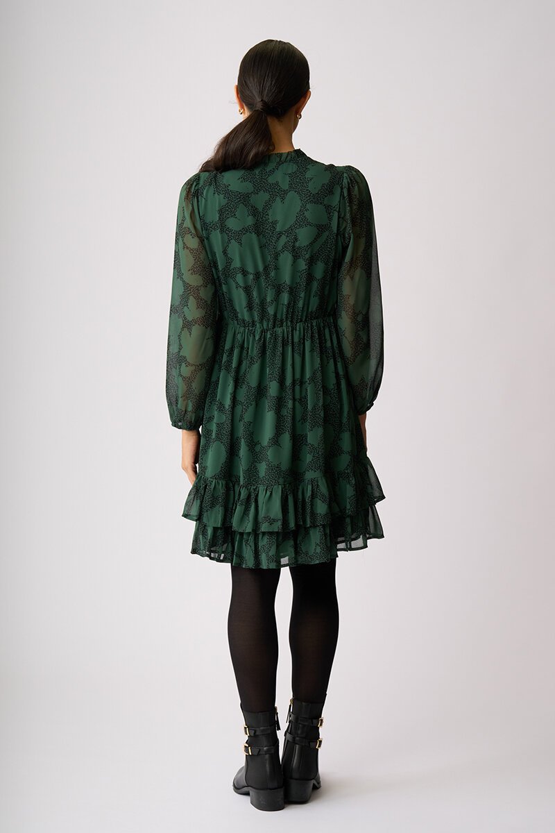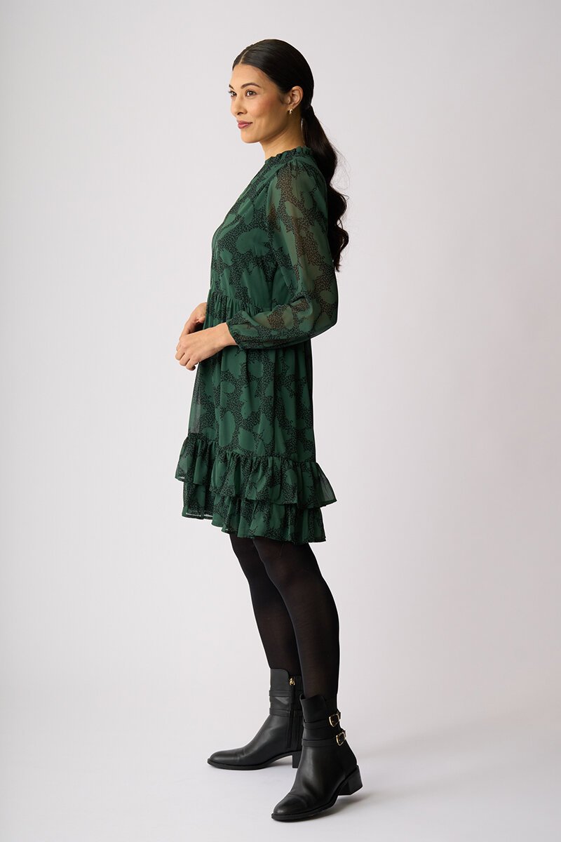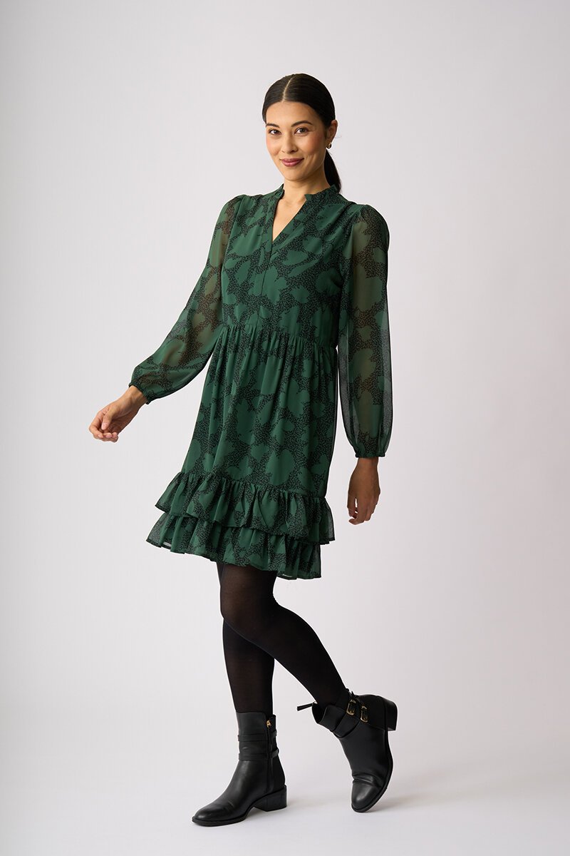 Floaty, feminine and ready for compliments. The Tier It Up Dress features a soft V neckline, gathered waist and double frill hem for beautiful movement. Sheer sleeves add lightness — just add boots or loafers and go.