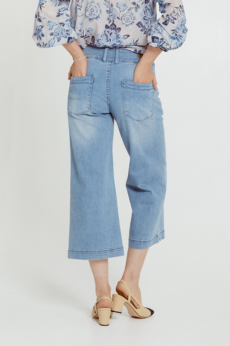 The New London Dorset Jean is a cropped, wide-leg style crafted from stretch fabric. With a classic fly front and practical pockets, these jeans offer both comfort and a modern silhouette. Perfect for pairing with your favourite tops for a laid-back, stylish look.