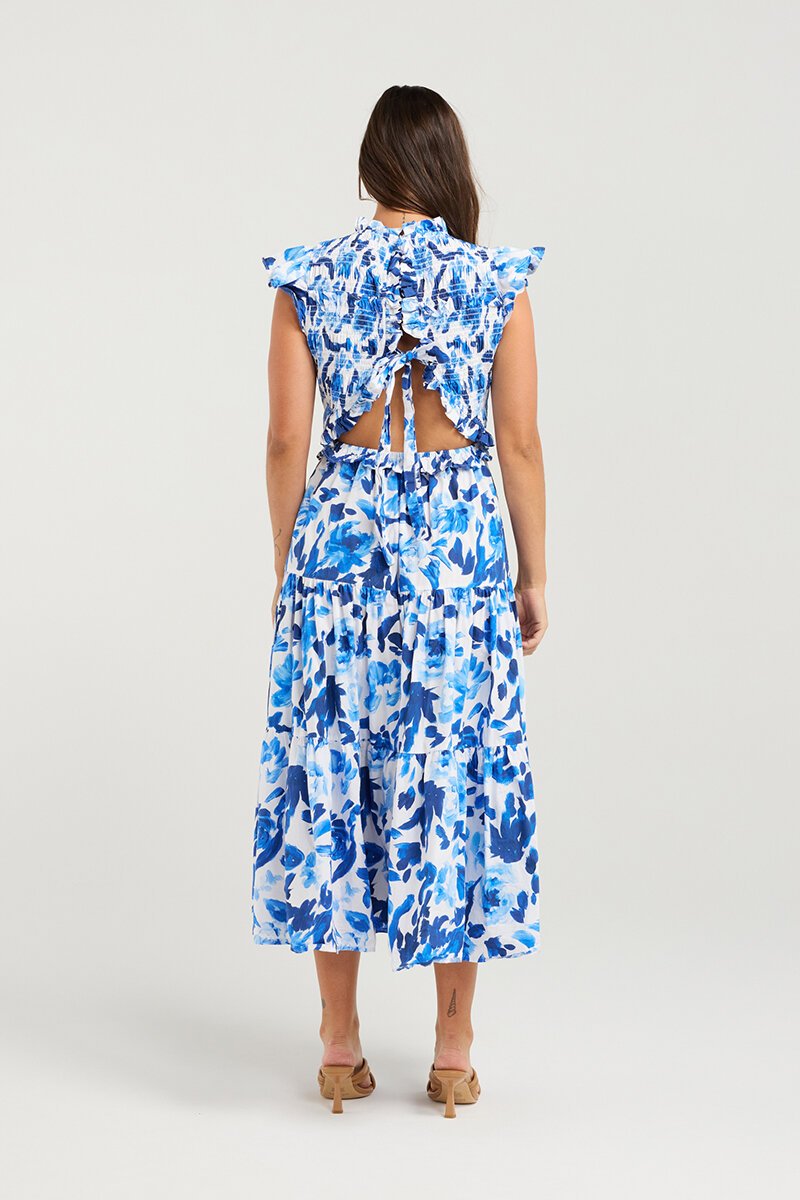 Meet your new summer favourite: the Mia Dress Blue Floral. Feminine and fun, it features soft frills and a stunning open-back tie detail that catches the light beautifully. Add a heel for events or slides for relaxed weekends.