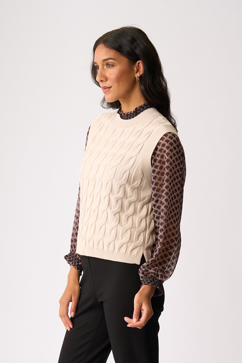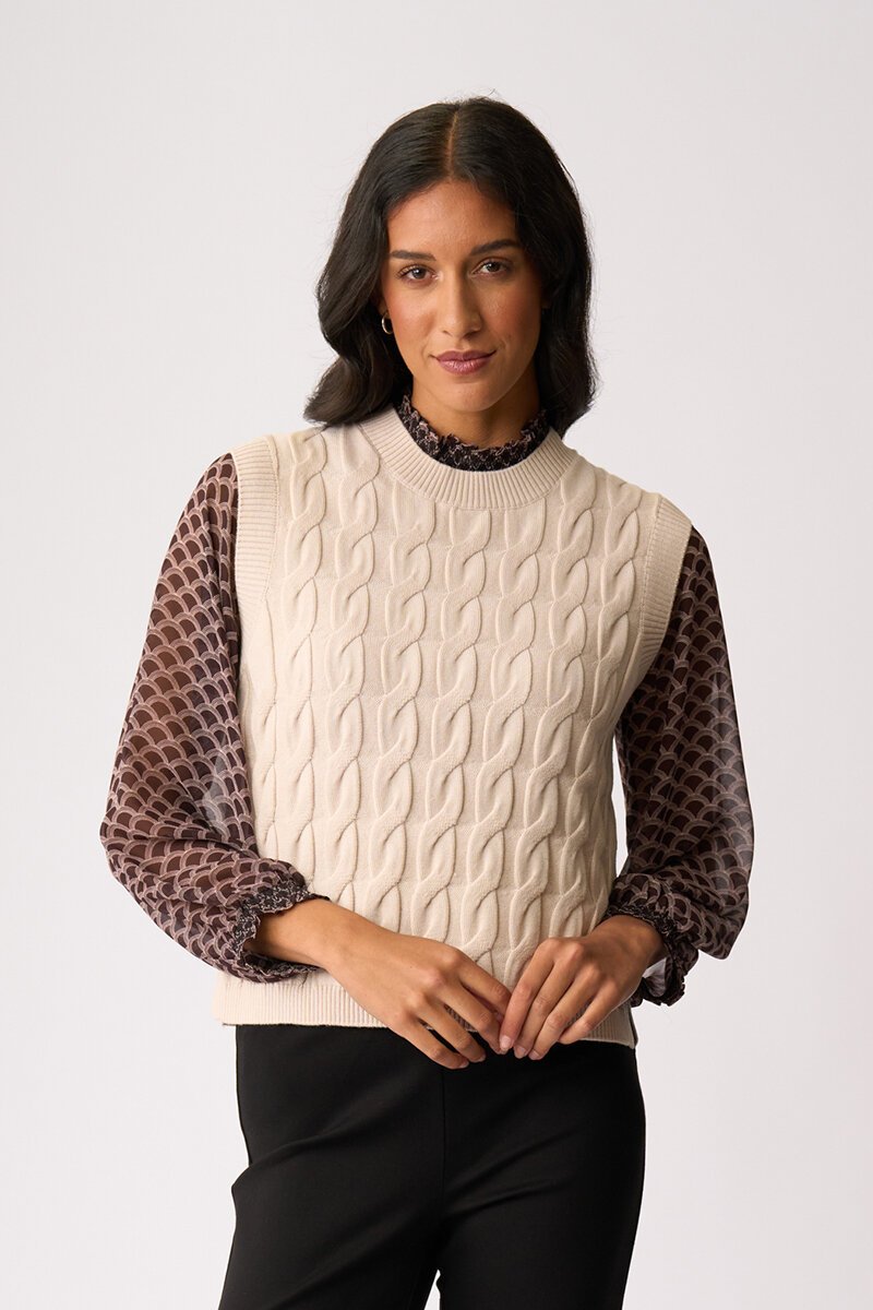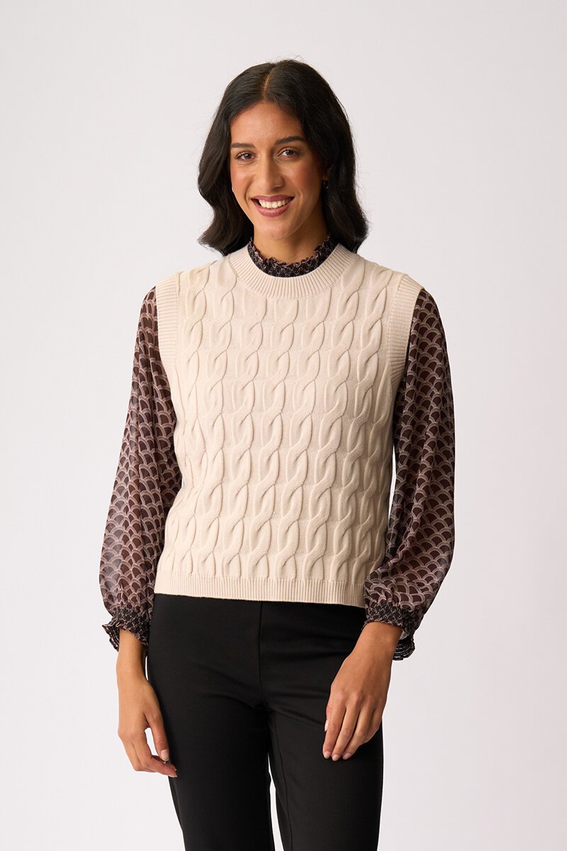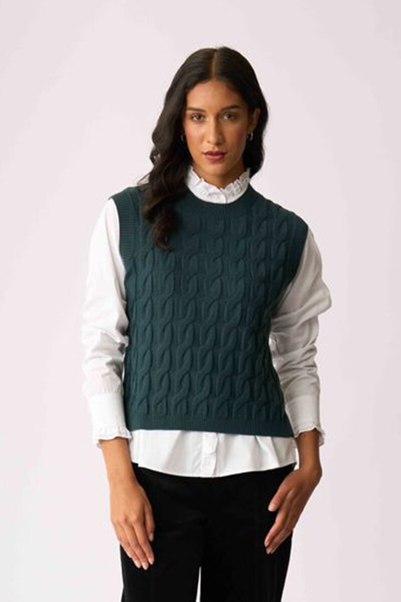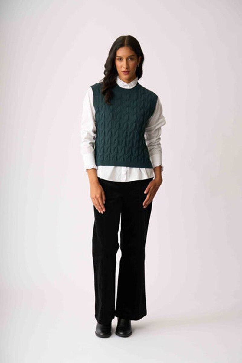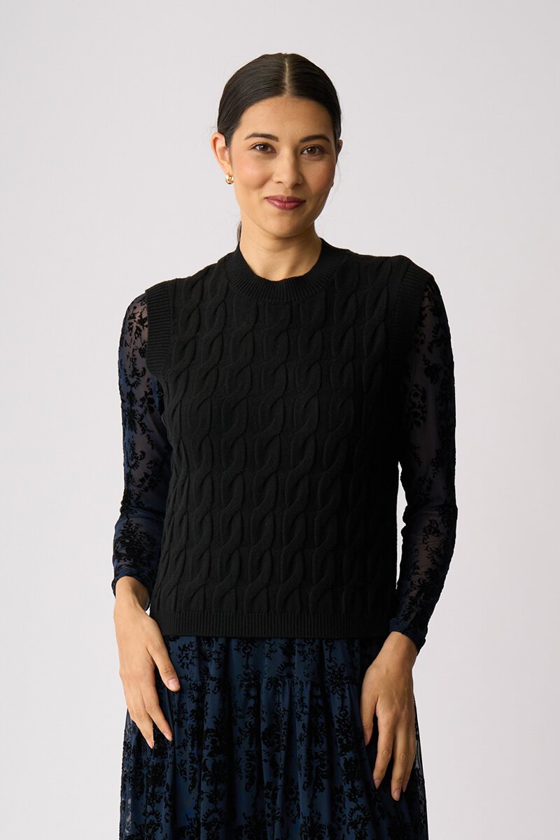 The Preen Cabled Vest is your layering hero with a little texture twist. Classic cable knit with a relaxed fit, it’s perfect over shirts or dresses for that polished, cosy feel.