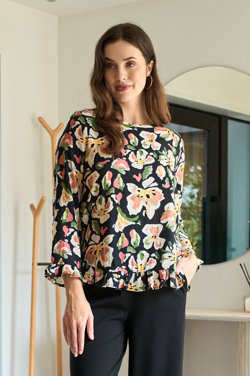 A little print, a little movement, a lot of feel-good. The gathered scoop hem adds soft shape and swing, while the relaxed fit keeps it easy to wear. The kind of top that makes everyday outfits feel special.