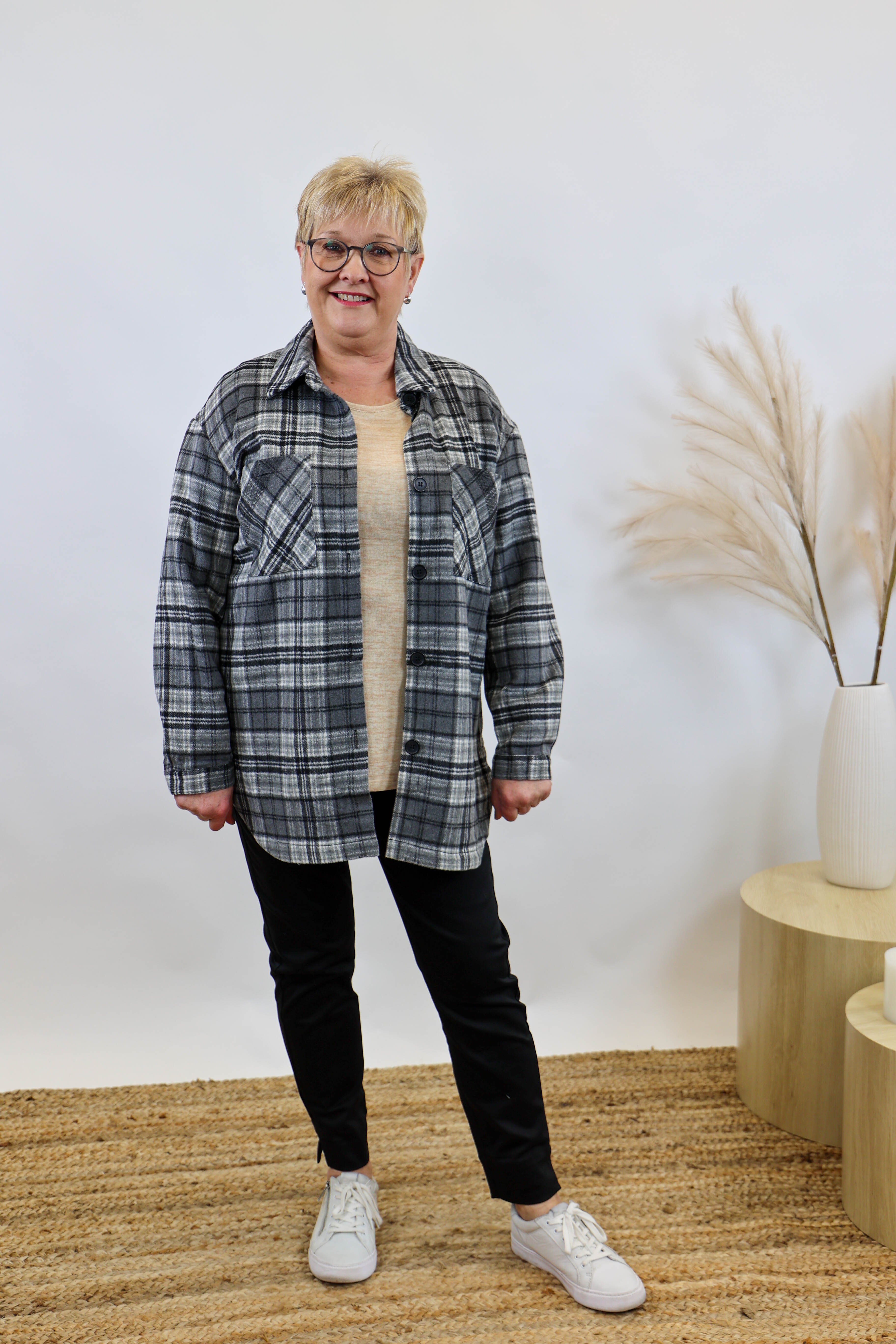 Did you know a shacket is a cross between a Shirt and Jacket!  Preen present to you this trendy yet incredibly practical jacket, great for layering. Featuring two front patch pockets, a button down the front and collar and drop shoulders and binding cuff.