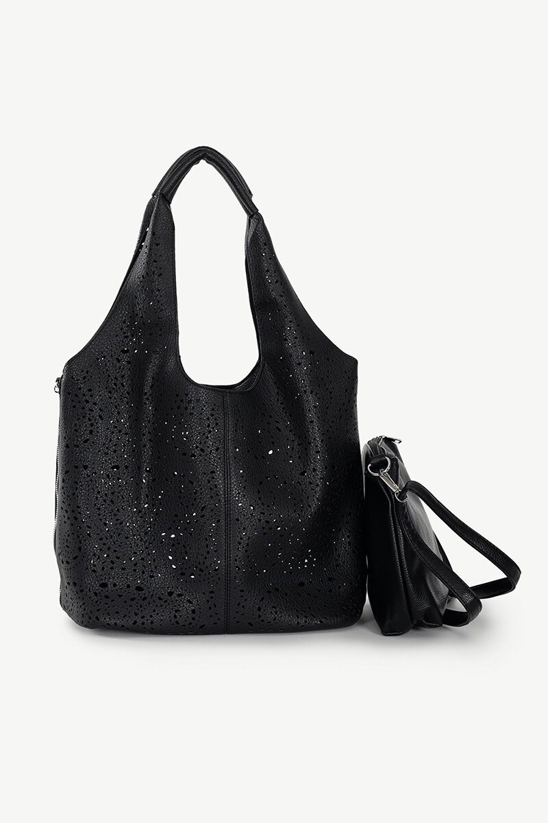 Inside, you’ll find a spacious removable pouch that doubles as either a crossbody bag or an internal organiser — ideal for switching from day to night with ease.
