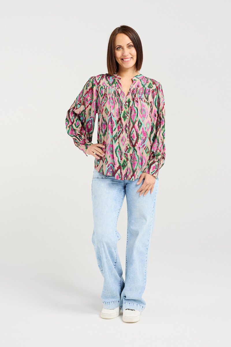 The Seduce Glynda Top is a gorgeous blouse that brings colour and personality to your outfit. This top drapes beautifully with soft gathers through the front and a vibrant print that looks stunning styled with denim or tailored pants.
