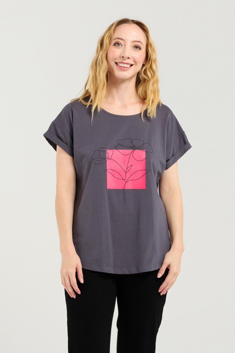 A playful twist on the classic tee, the Lily Print Top features a bold floral line print framed by a pop of pink. Designed with cuffed short sleeves and a relaxed fit, it’s an easy piece to elevate your off-duty look.