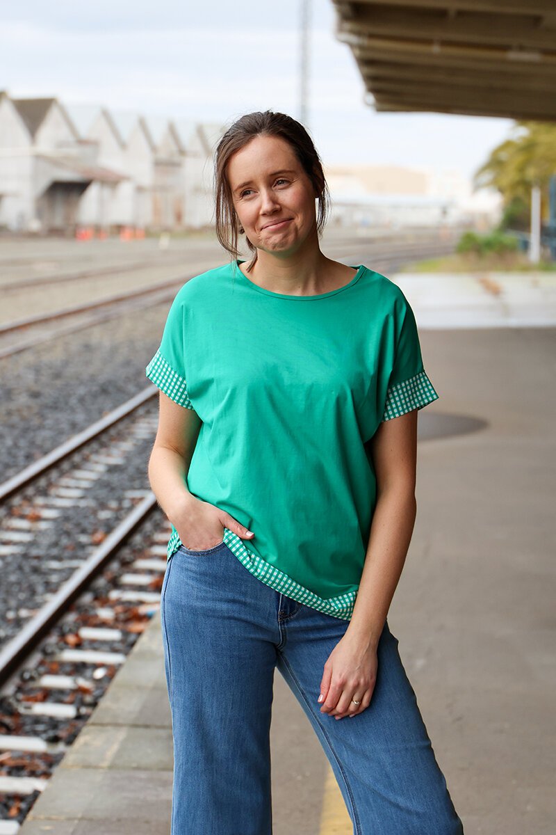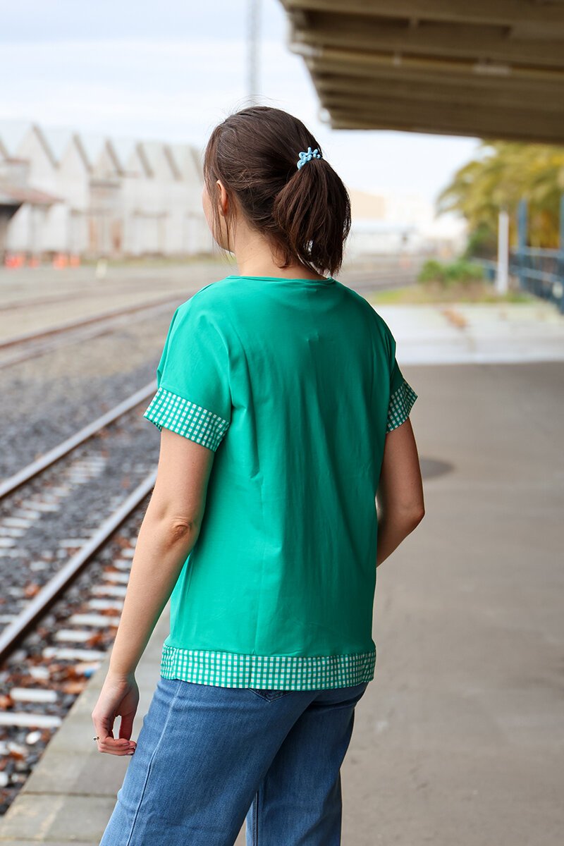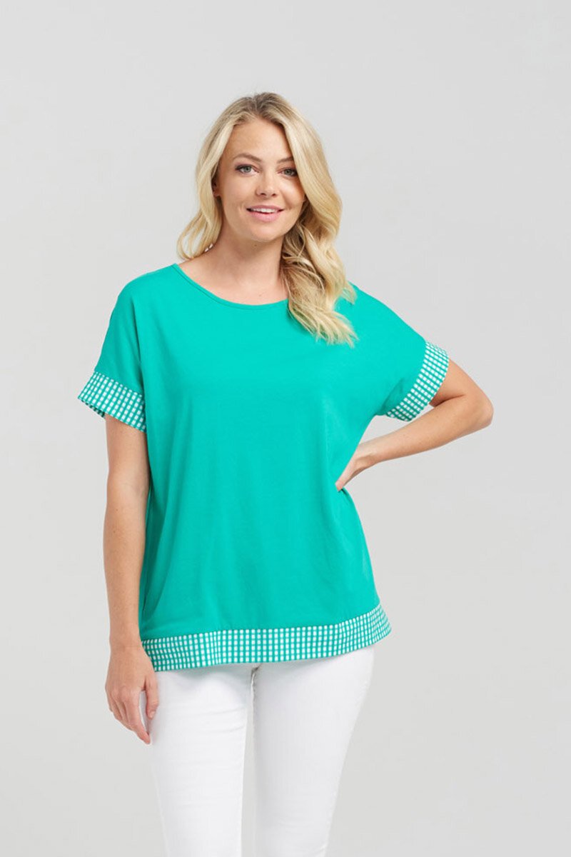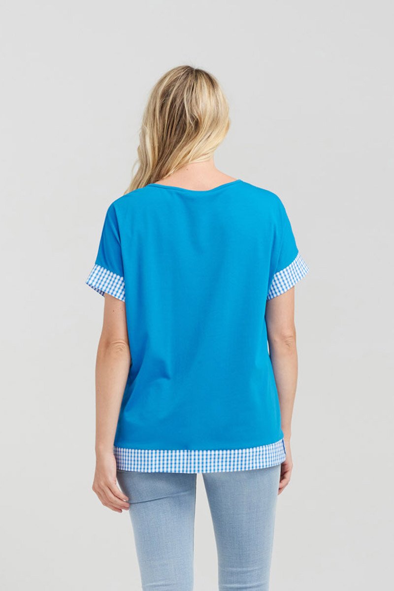 A classic basic t-shirt but with a twist. The contrast check fabric around the sleeves and waist gives this top a nice detail to complete your outfit.