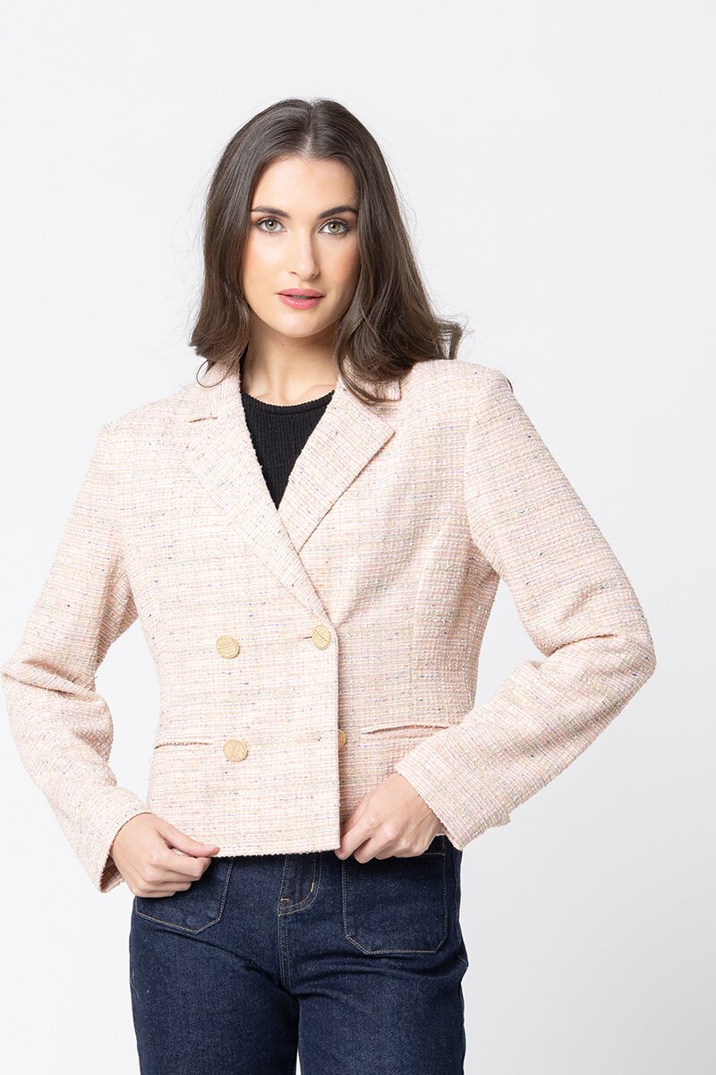 The Audrey Blazer means business, but not in a boring way. This fully lined blazer is cut from blush tweed with flecks of soft colour woven through, making it the kind of statement piece that still goes with everything. Gold embossed buttons add that extra lift, whether you're dressing it up or keeping it casual with denim.