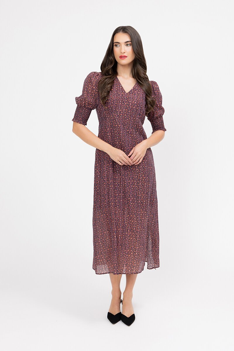 A versatile midi in a rich merlot hue with a subtle leopard pattern. Fully lined with elbow-length sleeves, it works just as well for casual days as it does dressed up with sleek black heels.