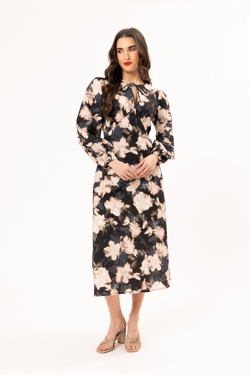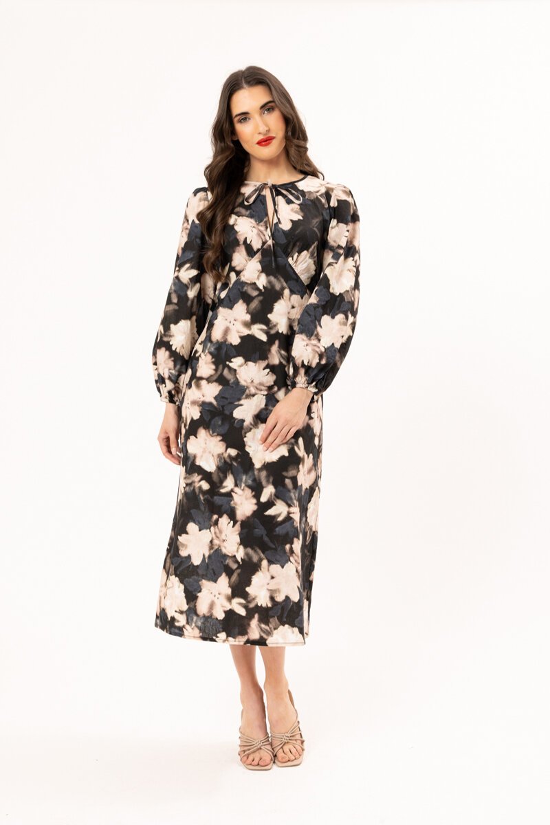 The Seeking Lola Elegant dress is a flattering floral midi dress with a softly tailored silhouette and waist tie detail. Long sleeves and a classic collar add structure, while the flowing skirt brings movement and feminine ease.