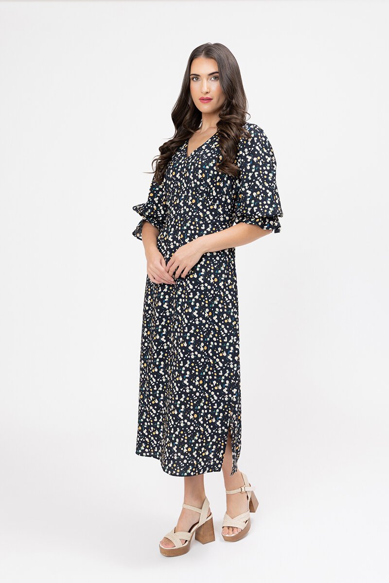 A soft V-neck, floaty sleeve, and midi length make the Madrid Dress a go-to for effortless dressing. The ditsy floral print adds a hint of sweetness, while side splits keep things breezy. Just add a wedge and go.