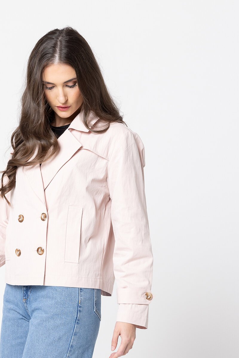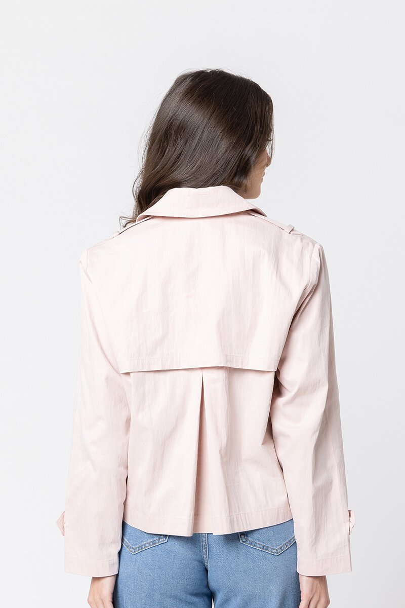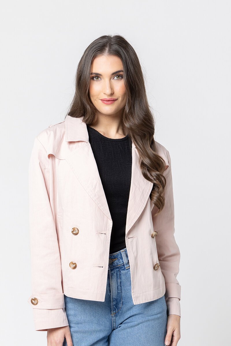 The Seeking Lola Mini Mack Jacket is a modern twist on a classic style. With its cropped length, double-breasted buttons, and relaxed structure, it’s the perfect lightweight layer for everyday wear—easy to throw on and instantly sharp.