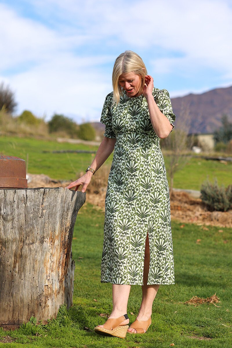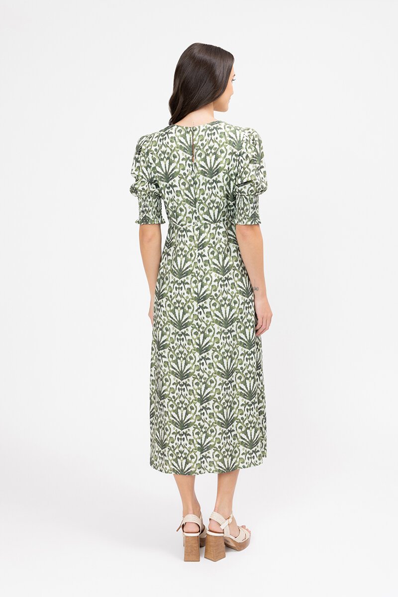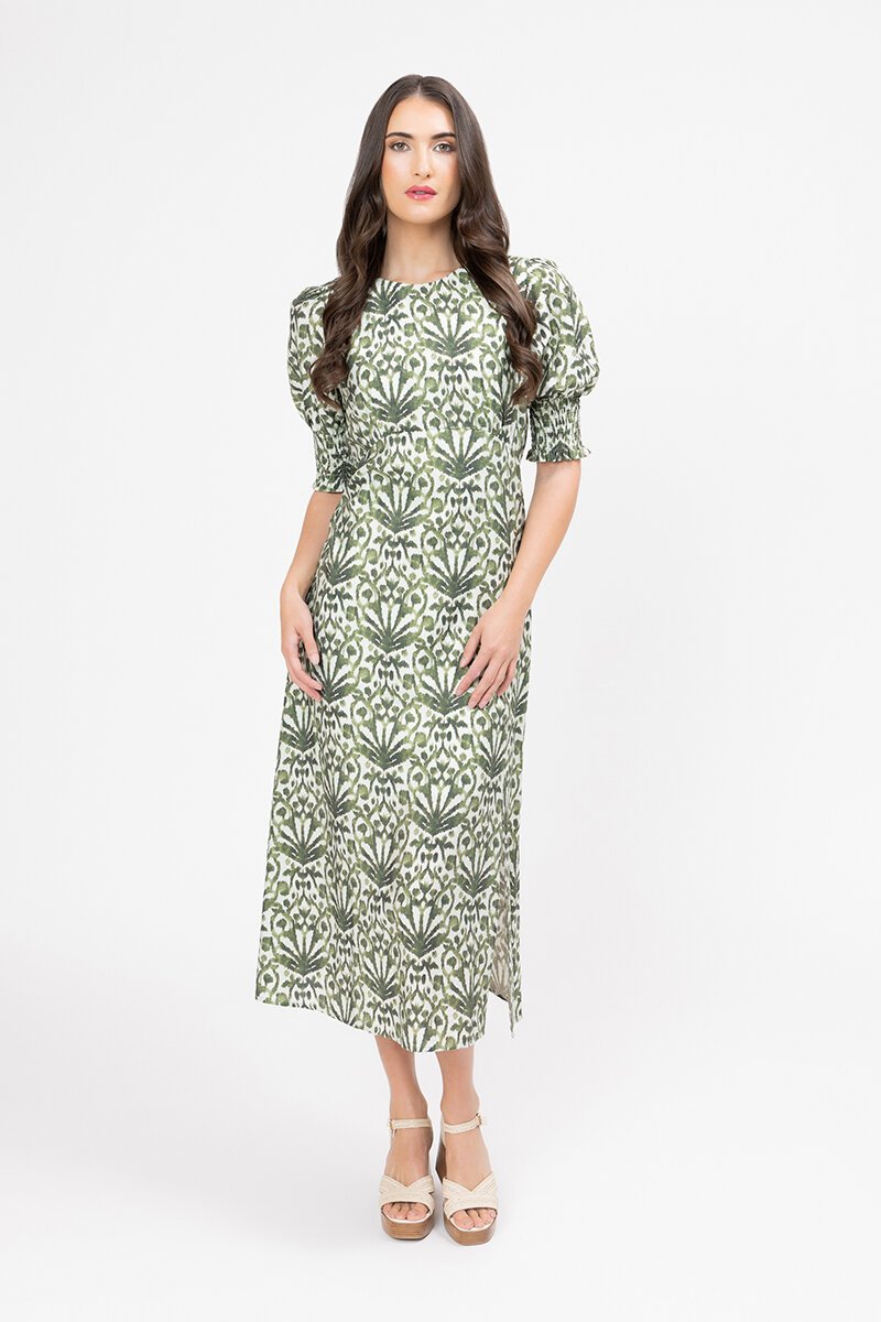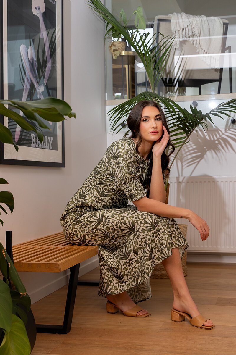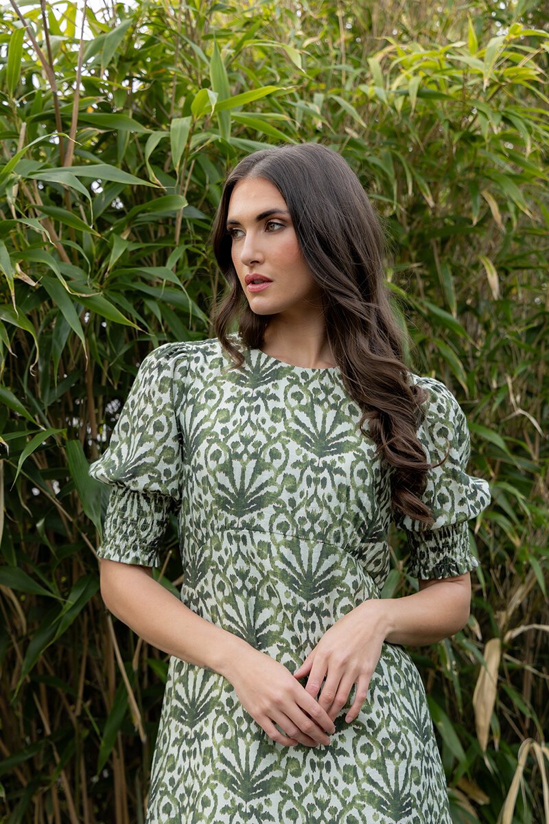 The Sunset Dress is all about understated elegance. Designed in a soft green stone print with a subtle palm-inspired pattern, it features puff sleeves with shirred cuffs, a fitted bodice, and a relaxed A-line skirt with a side split for movement. It’s easy to dress up with heels or keep casual with slides.
