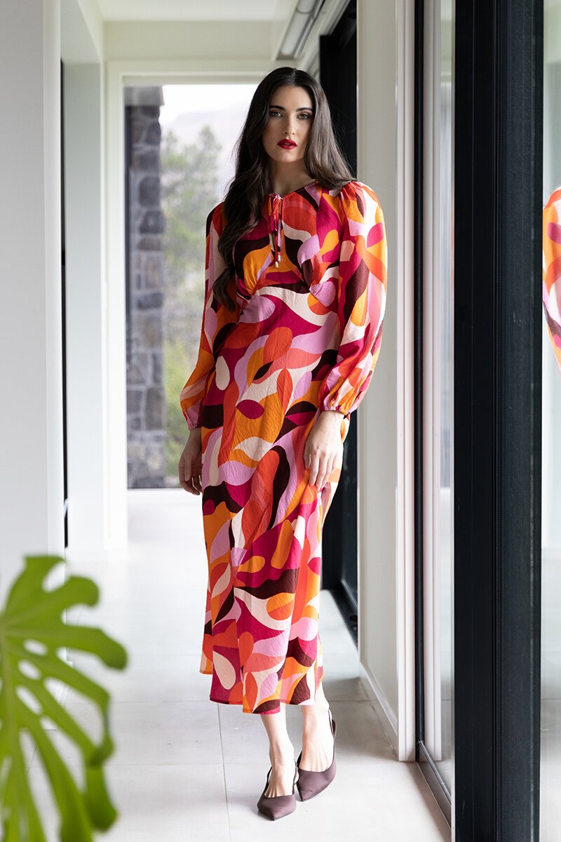 The Seeking Lola Elegant Dress features a vibrant Warm Vibes print with a flowing silhouette, tie neckline and blouson sleeves. An easy statement dress that moves beautifully from day to evening.
