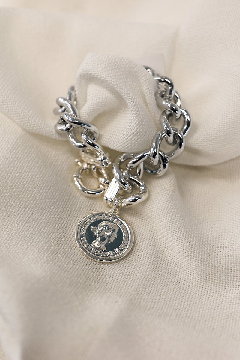 The She Jewellery Empire Coin Bracelet makes a statement without saying a word. With chunky chain links and a detailed coin pendant, it’s bold, refined, and ready to shine. The perfect power piece for dressing up denim or pairing with evening looks.