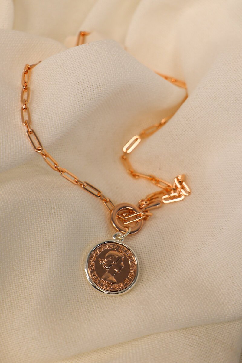 The She Jewellery Royal Coin Pendant Necklace blends heritage style with modern polish. Featuring a delicate link chain and an embossed coin pendant framed in contrasting metal, it’s refined yet easy to wear. The perfect everyday piece with just a touch of regal flair.