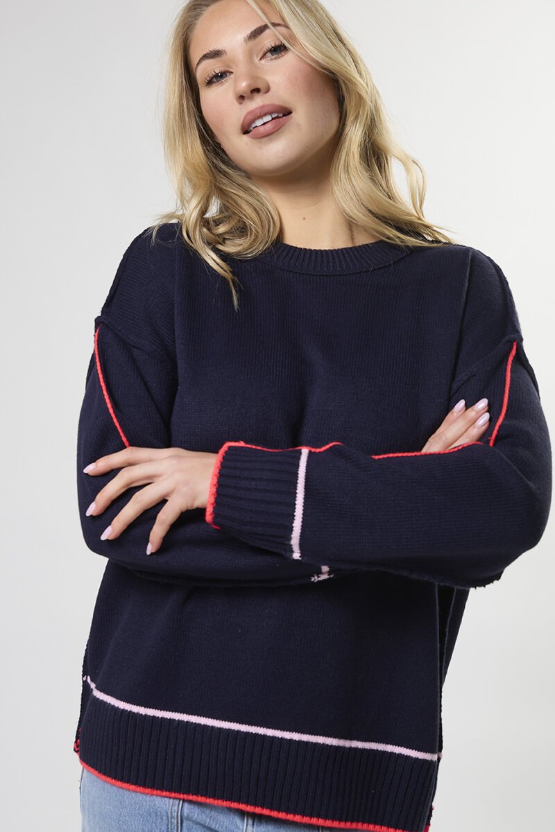 The Stella + Gemma Dallas Jumper is a relaxed knit with a sporty edge. Finished with contrast piping and ribbed trims, it’s an easy throw-on that adds a little extra to everyday denim, joggers, or layered looks.
