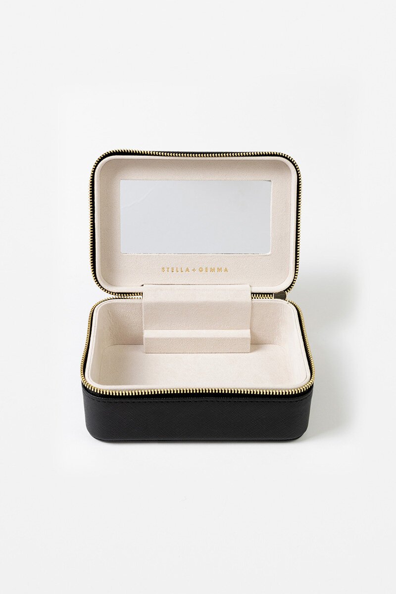 The Stella + Gemma Large Rectangle Jewel Box keeps your jewellery organised and protected, featuring a structured interior, soft lining, mirror detail and secure zip closure—perfect for home or travel.