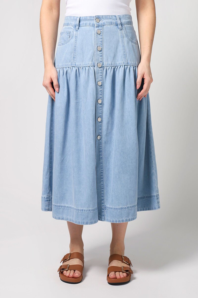 The Stella + Gemma Lou Skirt is denim done with a softer edge. Featuring a button-through front, tiered seam detail, and practical pockets, it’s a midi that feels relaxed yet put-together. Pair with sneakers, sandals, or boots—this one does it all.