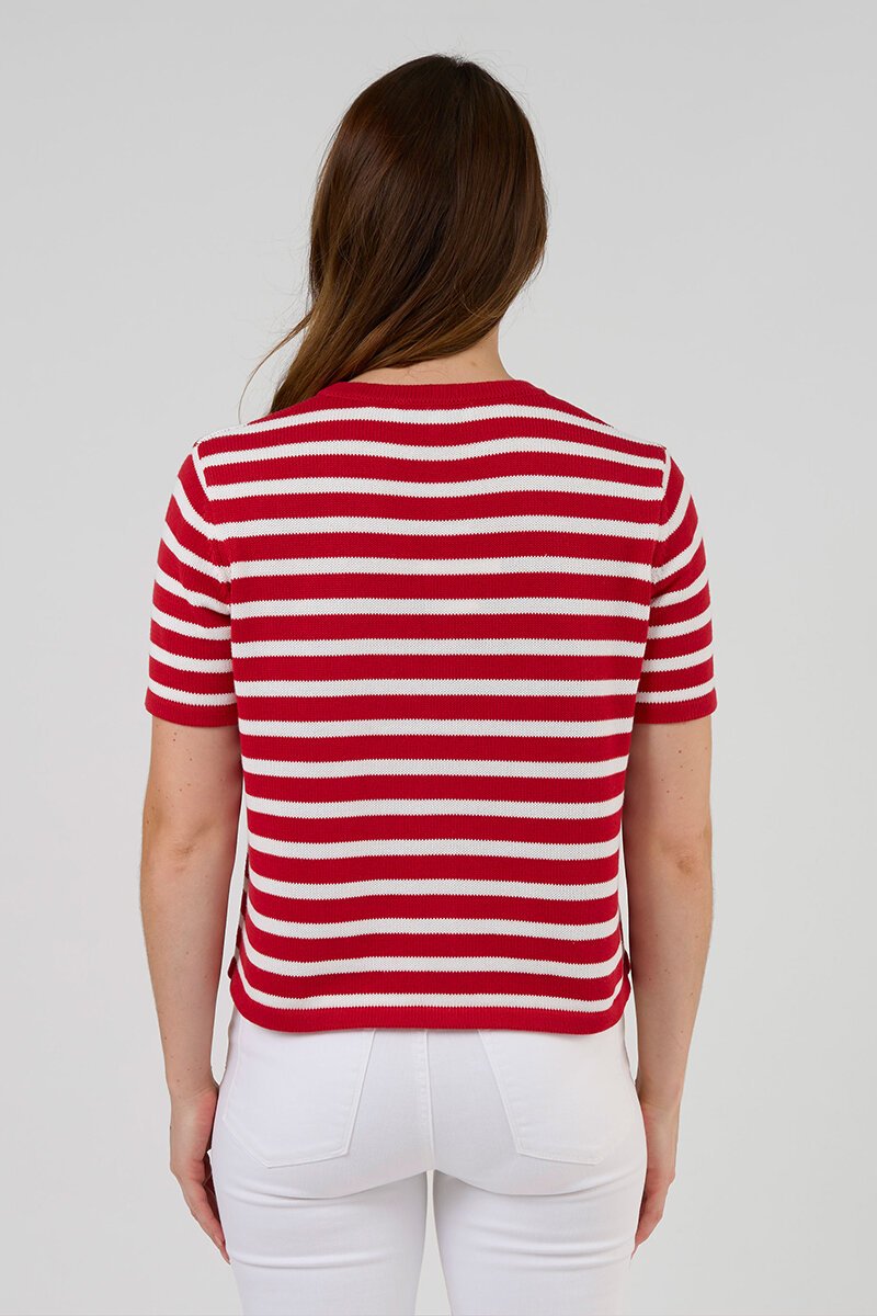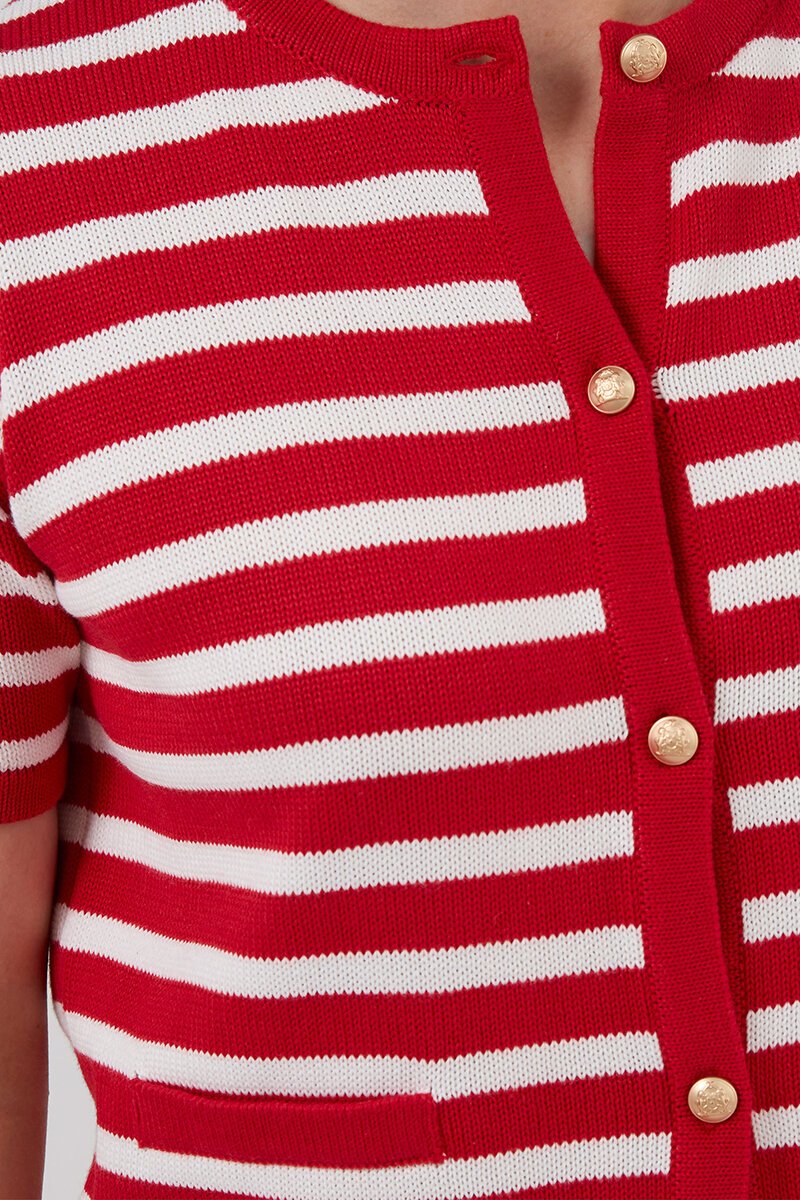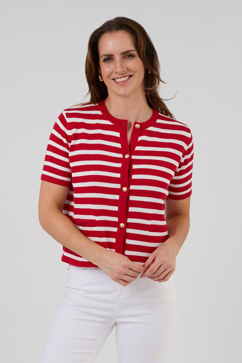 The Stella + Gemma Rue Stripe Cardi is your new go-to knit with a playful twist. Featuring a cropped fit, short sleeves, and bold stripe detailing, it’s finished with gold buttons for a polished touch. Pair it with denim or layered over a tank for effortless, preppy style.