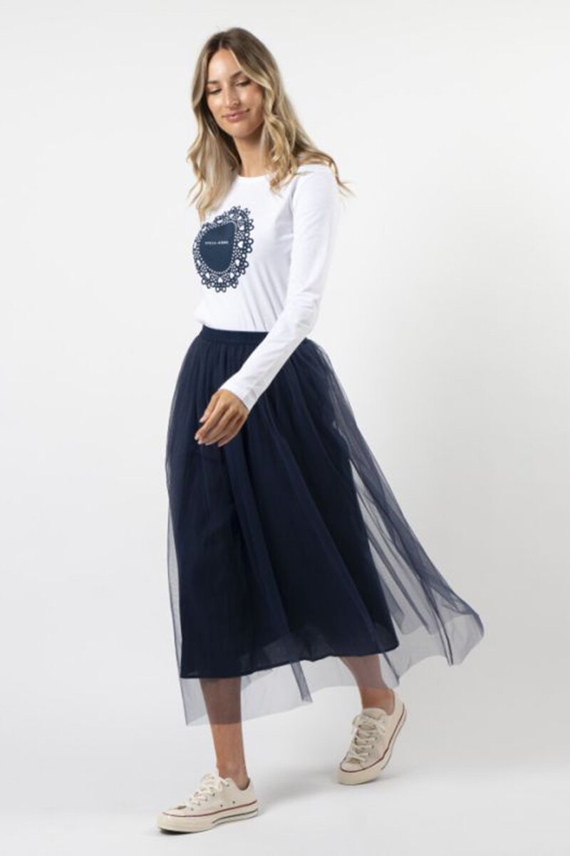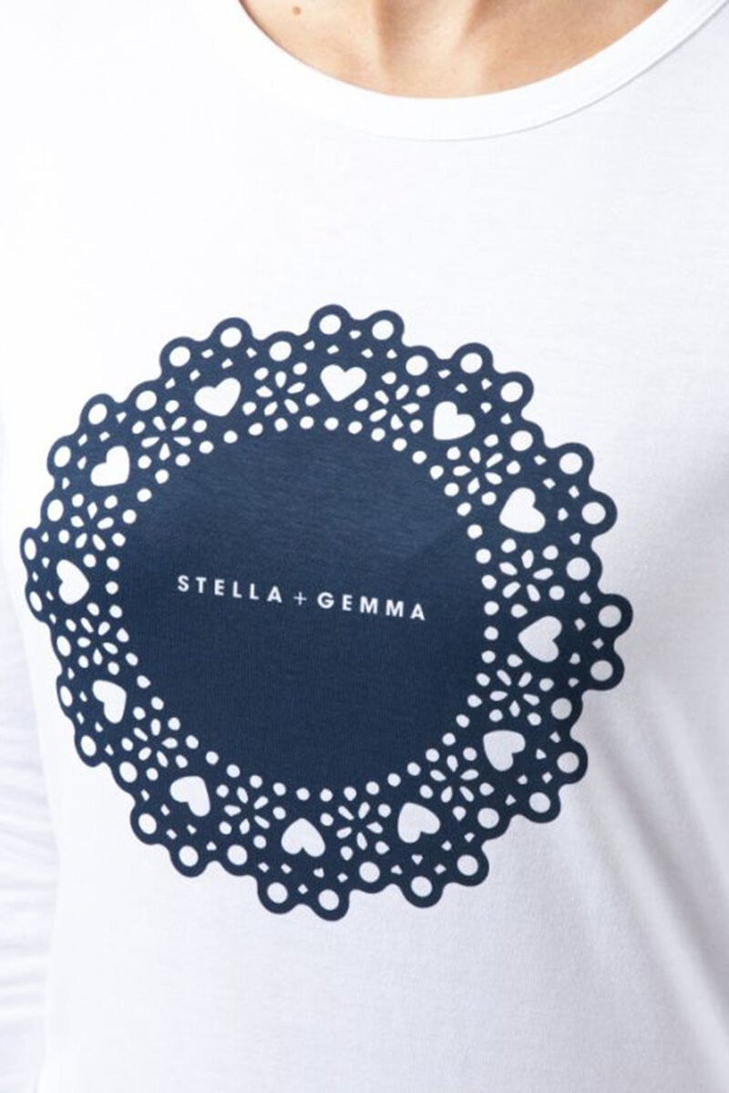 The Stella + Gemma White Doily LS Tee is a chic and versatile piece with delicate doily detailing. Perfect for adding a touch of elegance to your casual wardrobe.