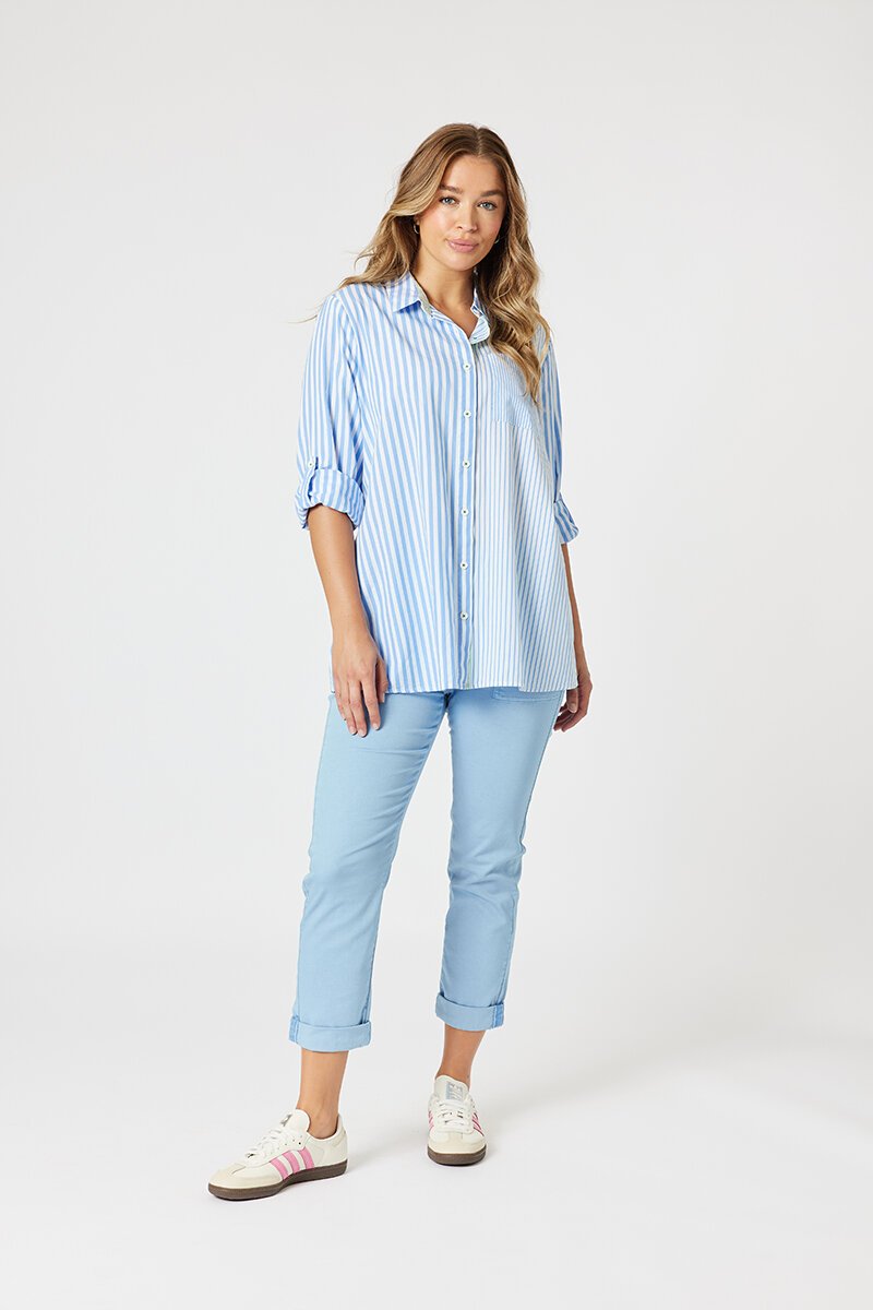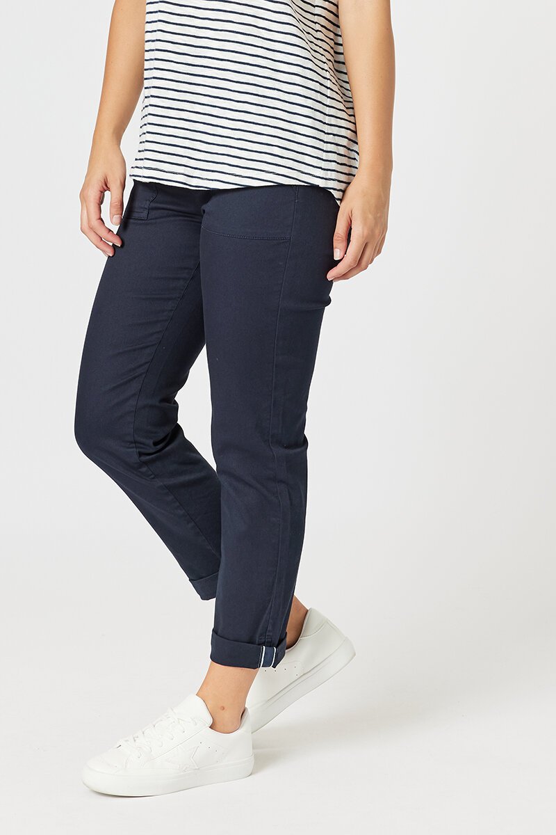 The Threadz Isabella Pant is a comfy, pull-on style with a slim leg and contrast tape detail at the hem. Stretchy, flattering and easy to wear—perfect cuffed or straight.