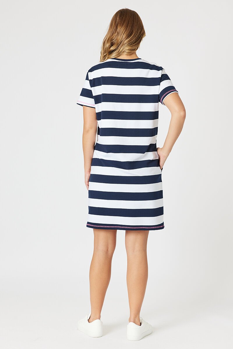 The Love & Kisses Dress delivers easy, everyday style with a fun twist. Crafted in soft stretch fabric, it features bold stripes, contrast stitching, and playful embroidered motifs. A relaxed fit and handy pockets make it perfect for casual days.