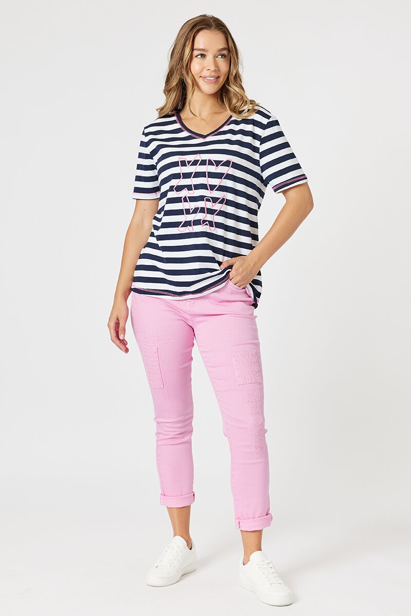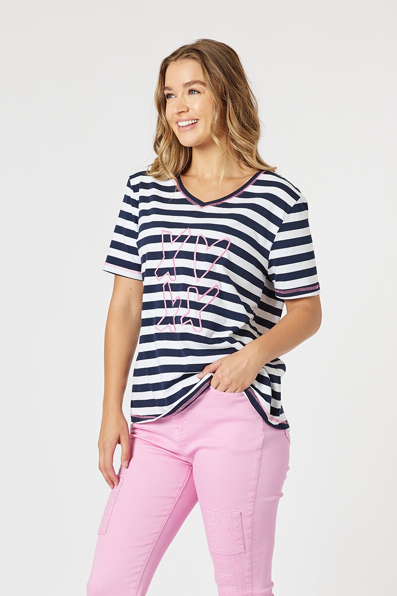 Add a playful touch to your everyday look with the Love & Kisses Tee. Featuring bold stripes, contrast stitching, and vibrant “XO XO” embroidery, this soft, relaxed-fit style pairs effortlessly with denim for casual days with personality.