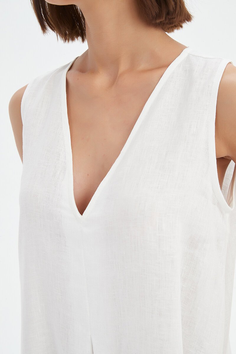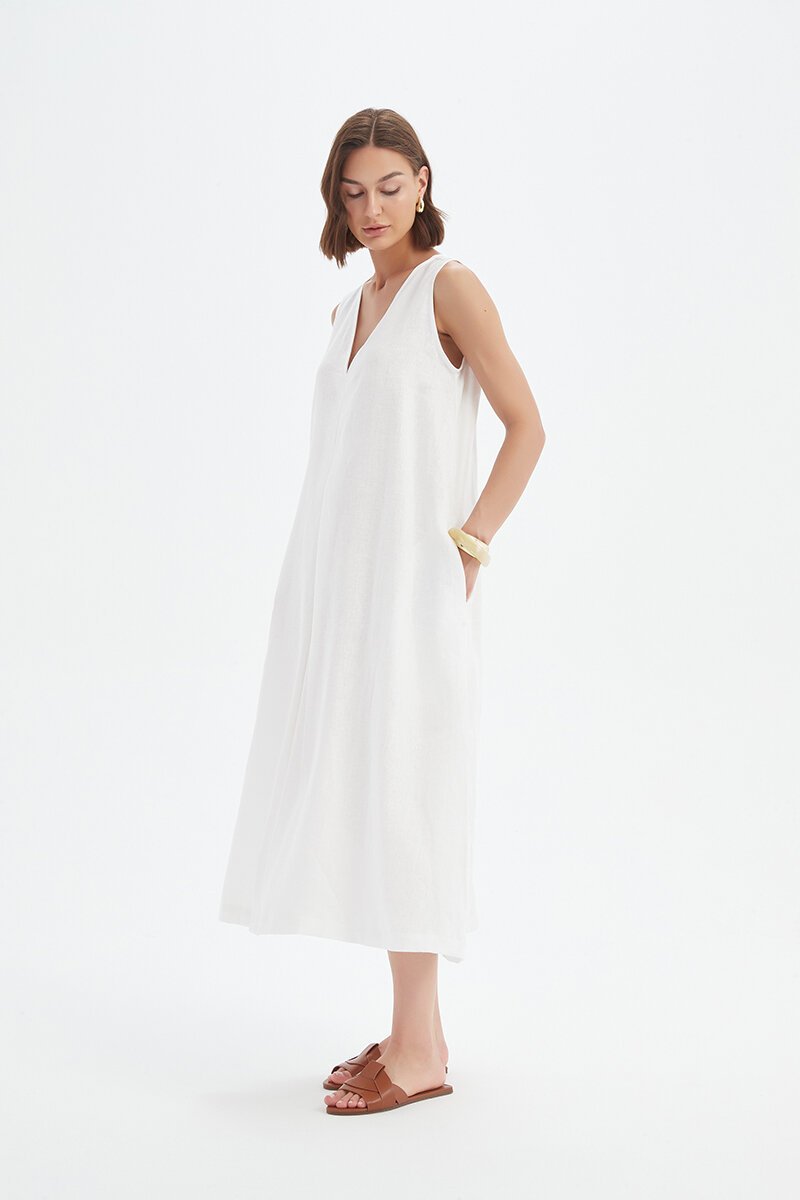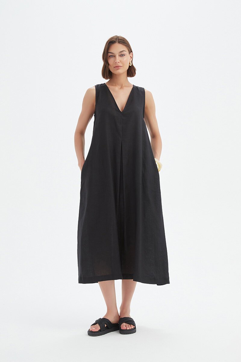 Meet your new summer throw-on: the Inverted Pleat Midi Dress. With its deep V-neckline, easy sleeveless cut, and flowy inverted pleat through the front, this dress is all about laid-back polish. It skims the body in just the right way and moves beautifully as you walk, making it the kind of piece you’ll want to reach for on repeat.