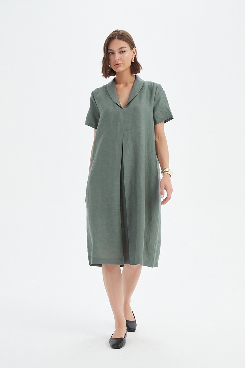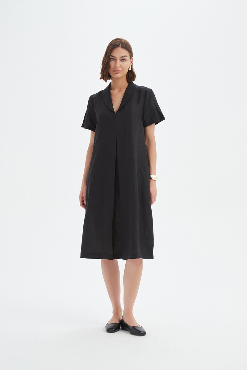 The Shawl Collar Pleat Dress is that one-and-done piece you’ll wear on repeat. With its soft shawl collar, short sleeves, and front pleat detail, it has just the right amount of structure while still feeling relaxed. Easy to dress up with flats or keep casual with sandals—it’s a true all-rounder.