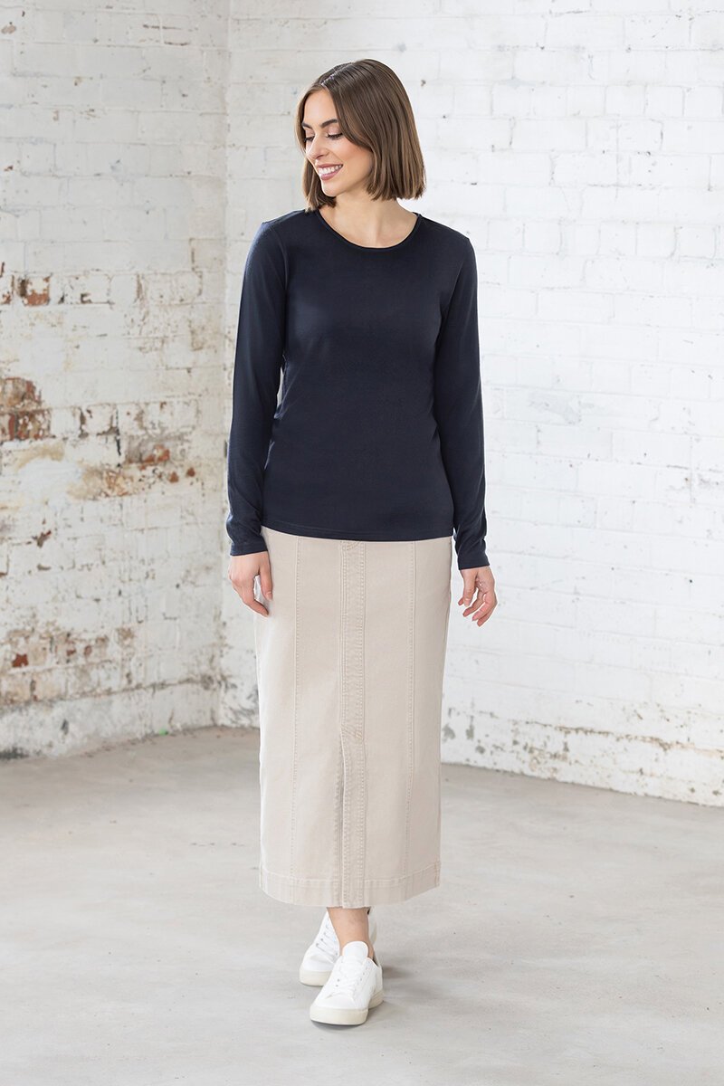 Classic long-sleeve merino top in Midnight — a deep dark blue. Designed as a versatile base layer, this style offers a smooth, lightweight feel with a clean, streamlined silhouette.