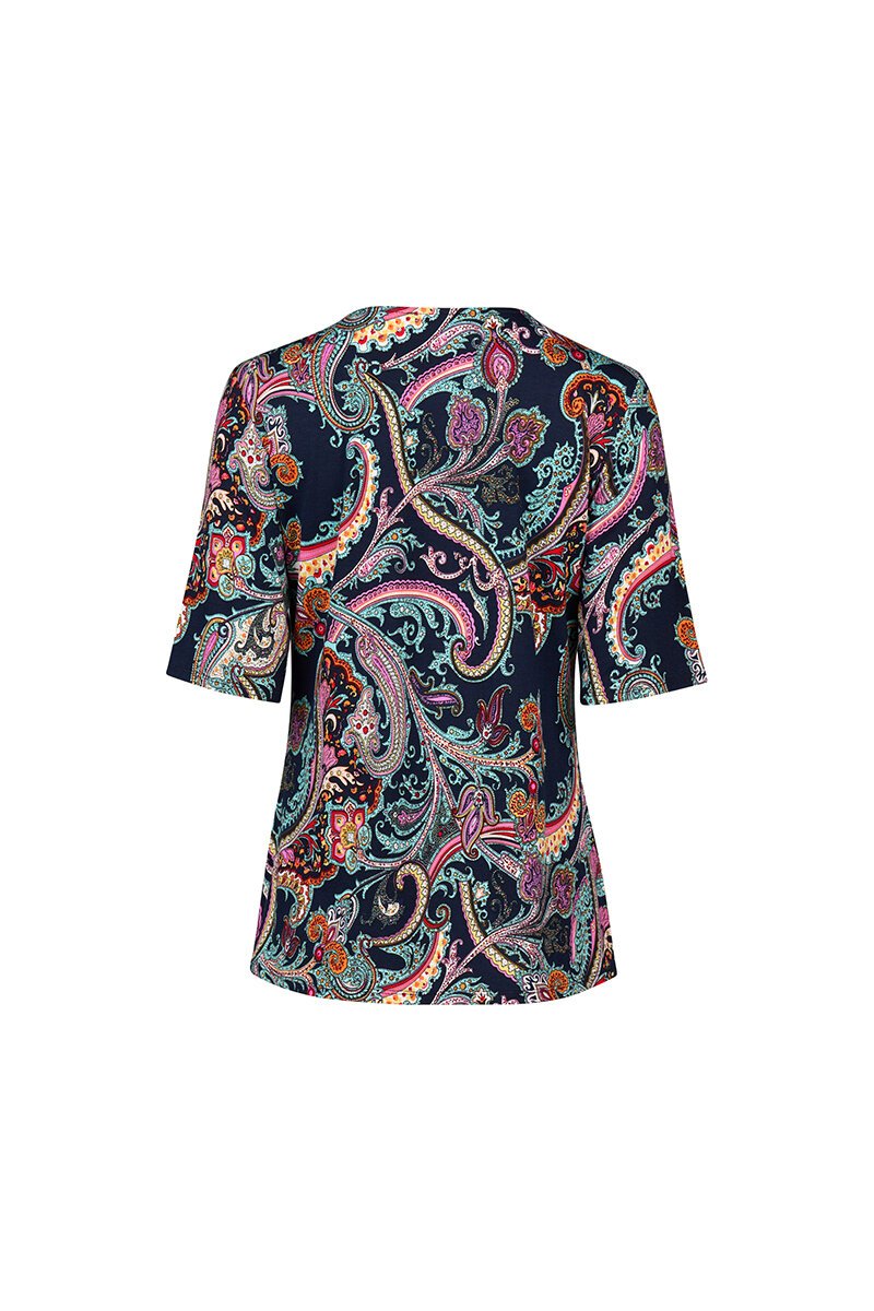 The Vassalli 3/4 Sleeve Round Neck Top in 'Persia' is a standout piece with serious personality. Featuring an intricate paisley print in rich, jewel-toned hues, this easy-wearing top brings vibrancy to your everyday wardrobe. The flattering round neckline and sleeve length make it a great go-to for work or weekends, and the soft stretch fabric ensures all-day comfort. Just add neutral pants and let the print do the talking.
