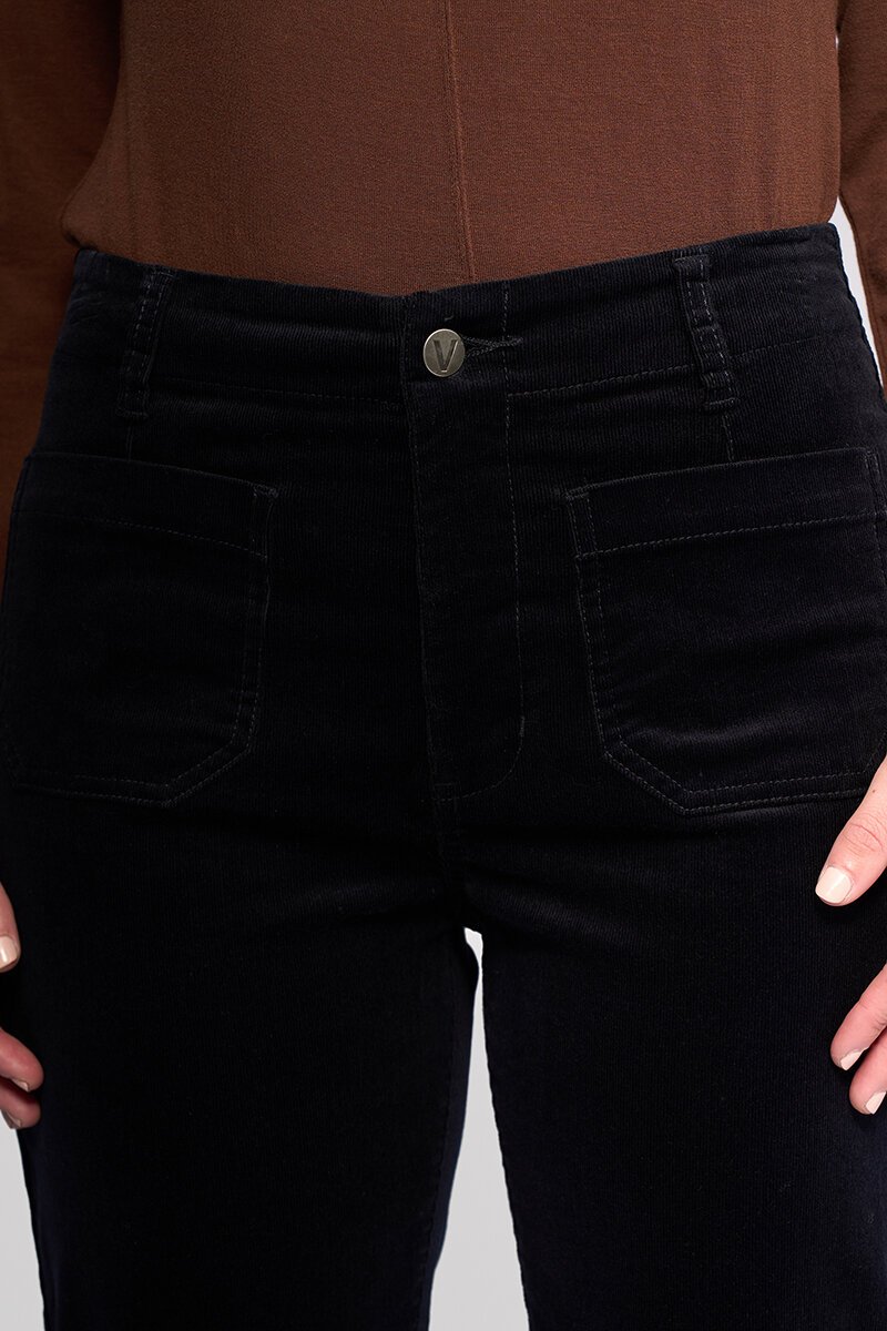 Wide-leg ankle-grazer pant in soft midnight corduroy, featuring a zip fly, metal V logo button and statement patch pockets. Comfortable, flattering and easy to style for everyday wear.