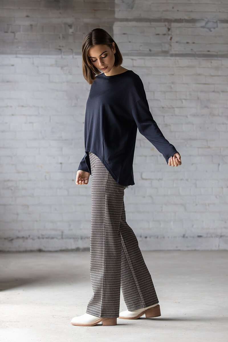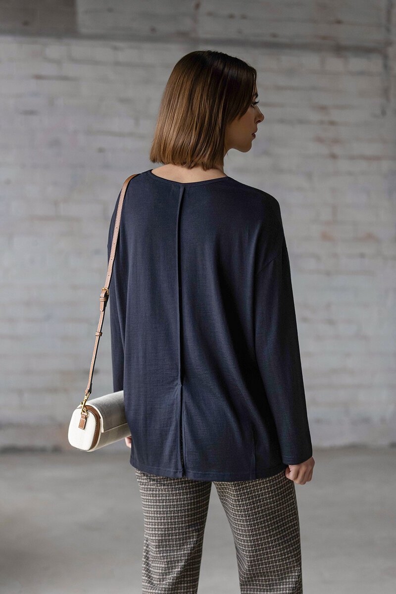Relaxed oversized merino top in Midnight— a deep dark blue. A softly structured style with an easy, oversized fit, designed to layer comfortably while maintaining a clean, considered look.