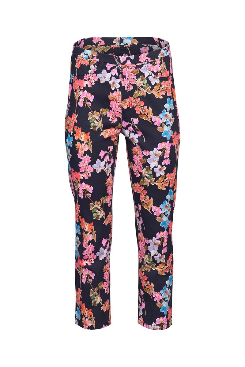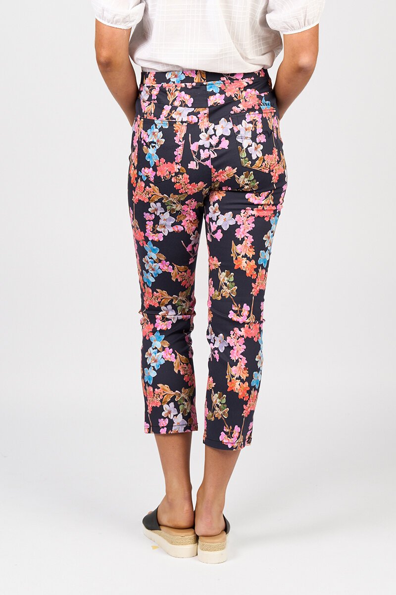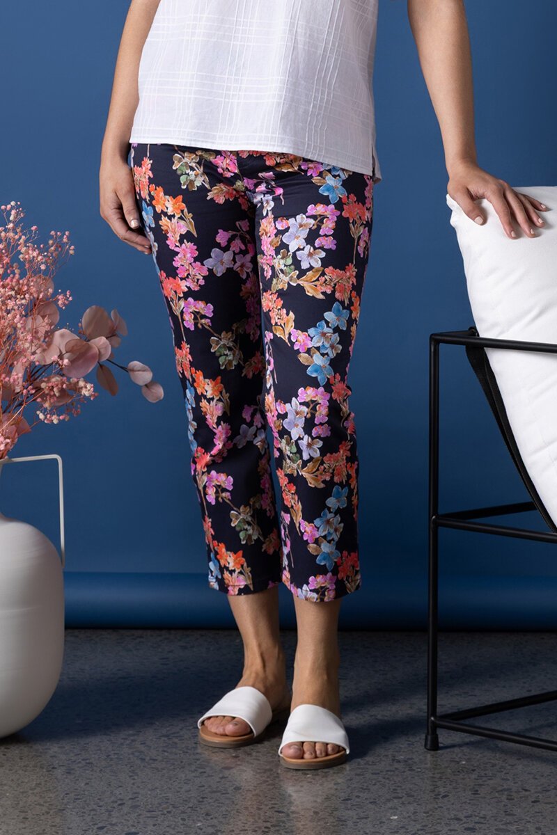 Bright, bold and ready to bloom—this is the Vassalli Slim 7/8 Lightweight Pull On Pant in Willa. Featuring a colourful floral print on a deep navy base, they’re a fresh way to add fun to your wardrobe. The easy pull-on waistband keeps things comfy, while the cropped slim-leg cut gives a flattering, fuss-free fit. Just add a simple top and let the print do the talking.