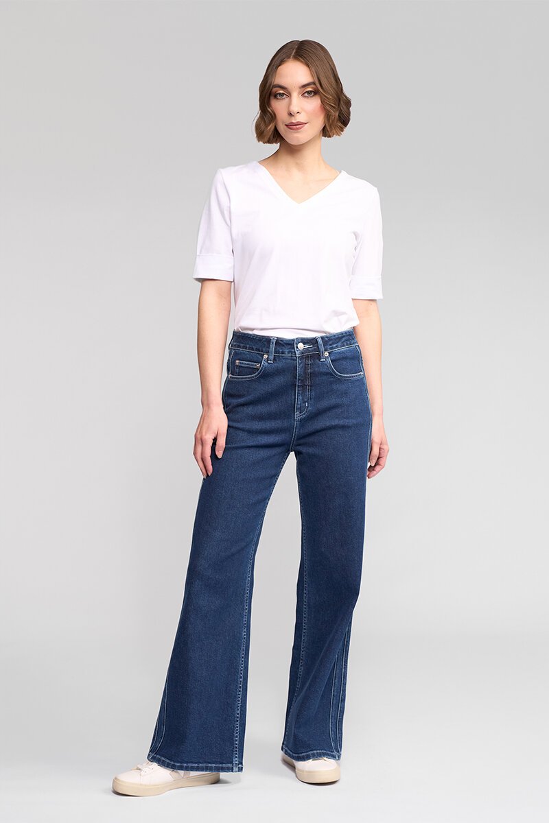 Wide-leg full-length jean, reflecting a modern silhouette. Finished with double side seam detailing, this flattering style elongates the leg and delivers an easy, polished option for everyday wear.